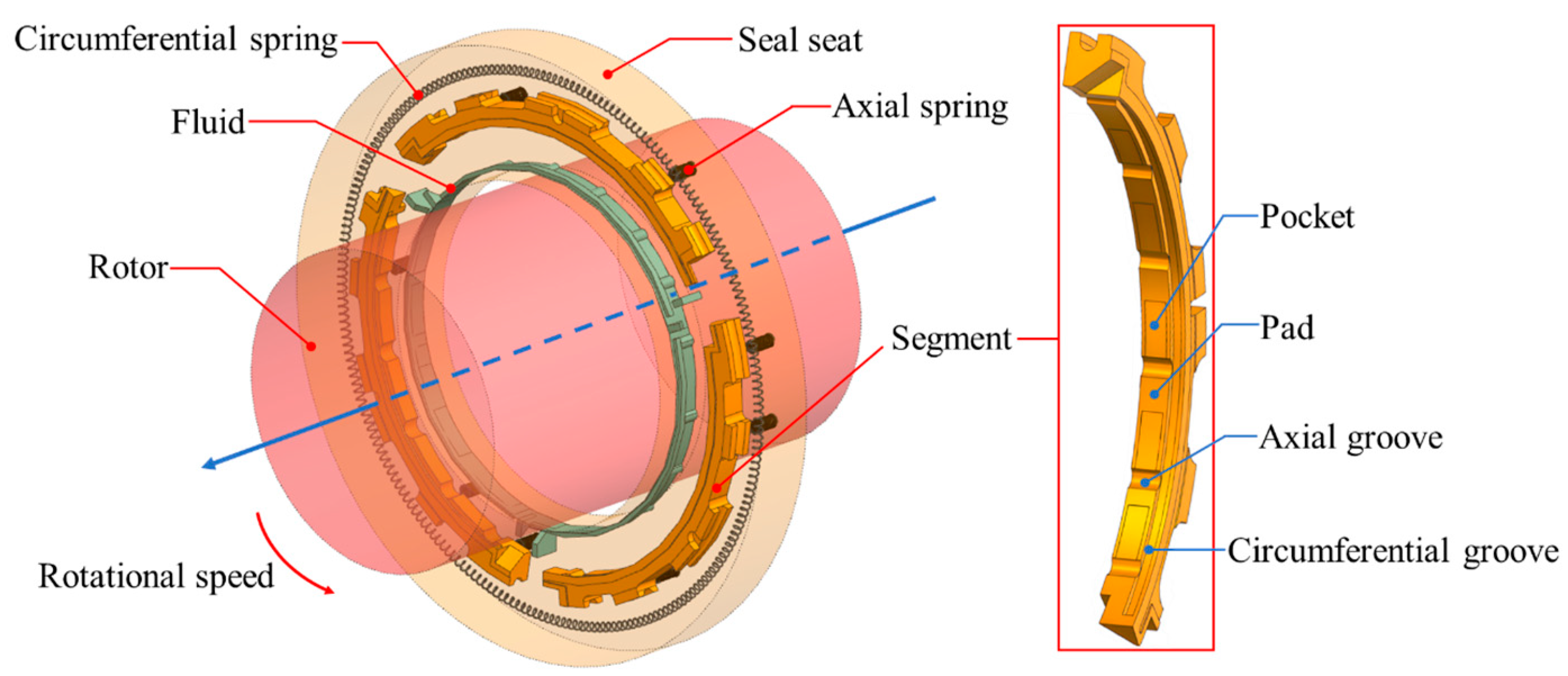 Figure 1. It is divided into the main sealing structure and the secondary sealing structure. The main sealing structure is mainly composed of a sealing ring body made of graphite material, consisting of 3 to 6 segments, which are tightly fastened to the circumferential spring on the rotor. The secondary sealing structure mainly consists of a sealing seat that wraps around the sealing ring, which serves to protect the main seal and prevent trace leakage. The sealing ring is fixed to the sealing seat under the compression action of the axial spring. The inner surface of the segment is usually provided with axial grooves and circumferential grooves to introduce fluid for lubrication. Some segments also have pockets on their inner surfaces to increase the opening force, enabling the sealing ring to reach a non-contact state as soon as possible, thereby reducing the friction loss of the sealing ring and extending its life.