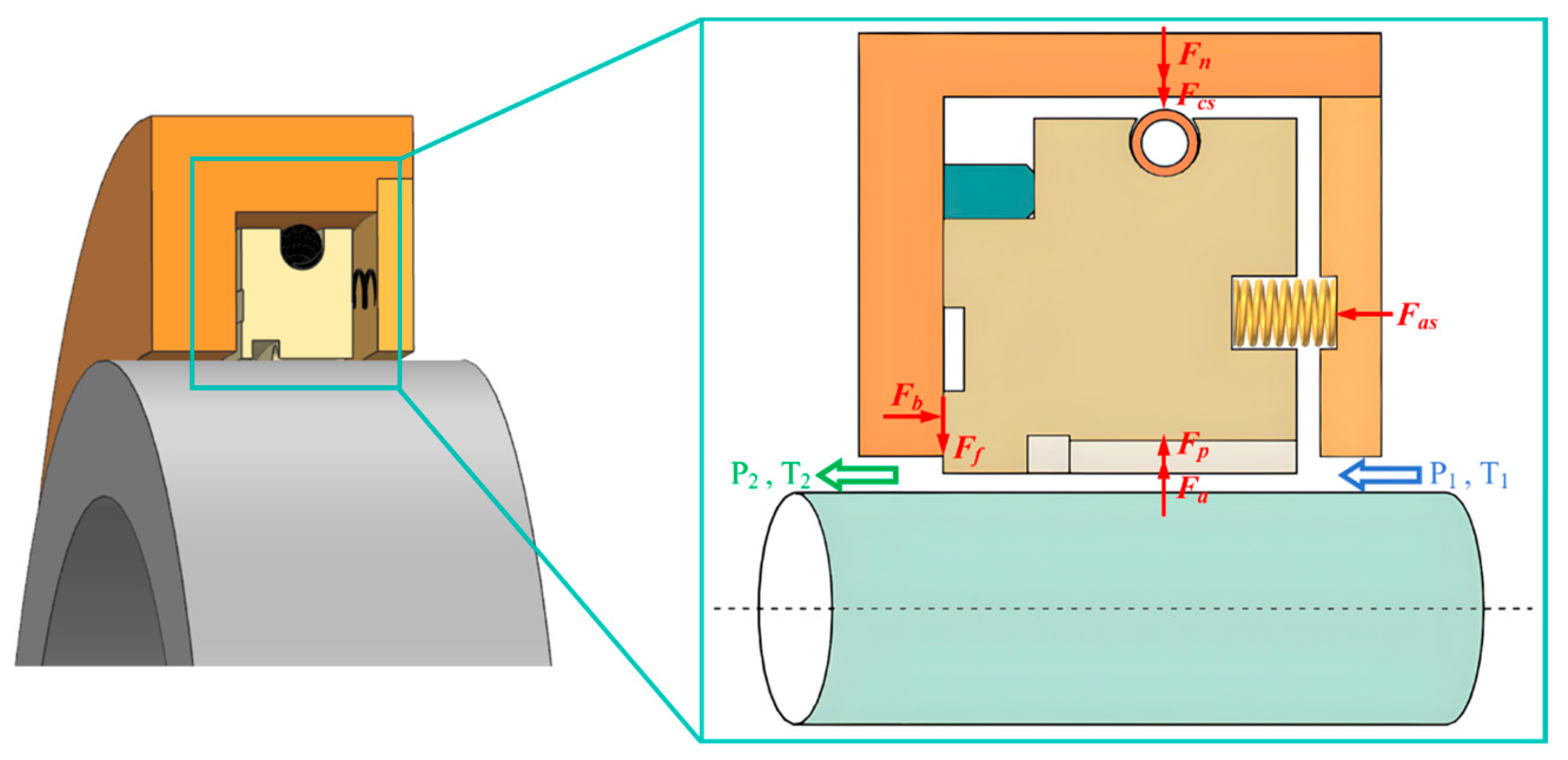 Fp hydrodynamic pressure on the right side of the equal sign in Equation (1) provides the opening force for the segmented annular seal.