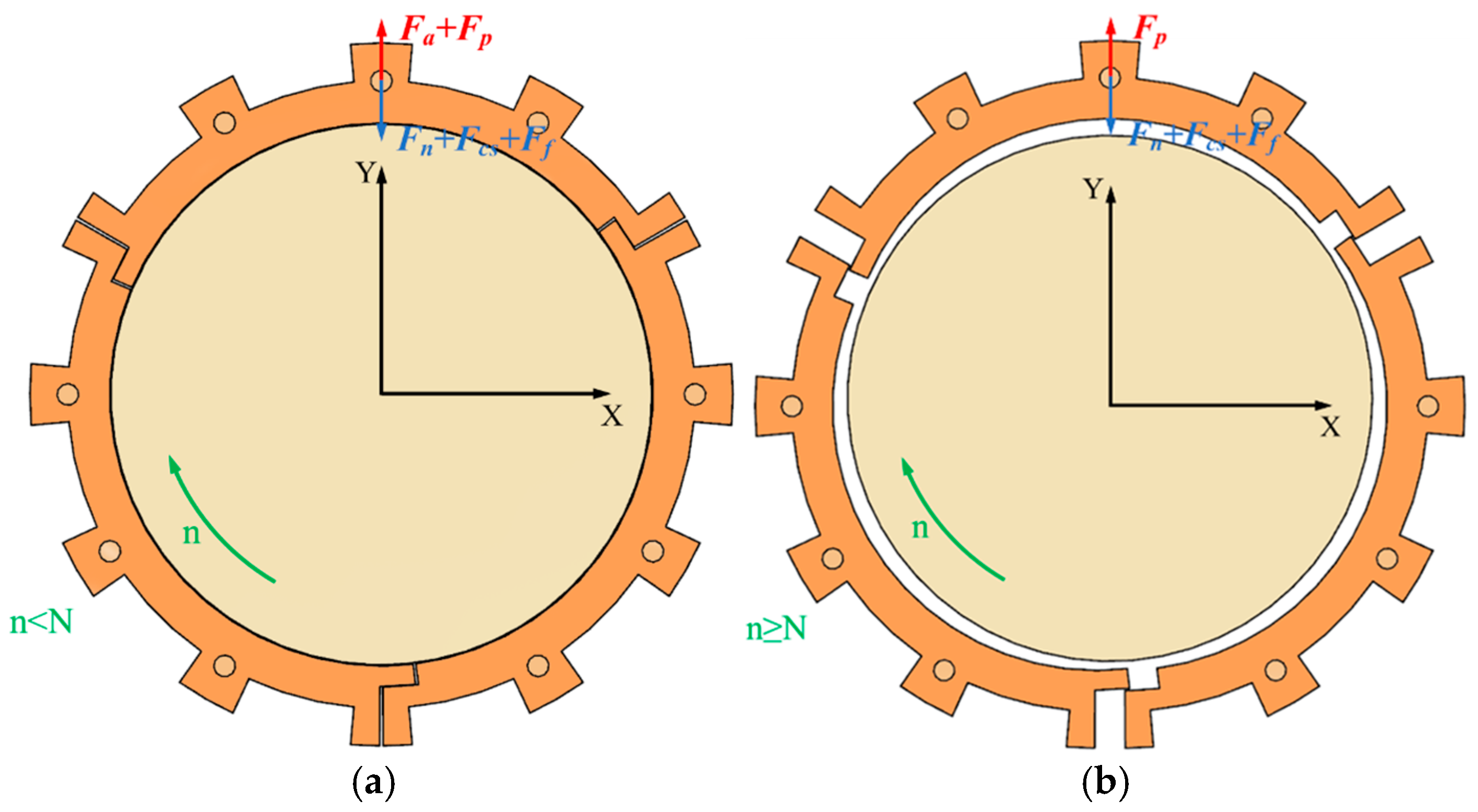 Fn + Fcs + Ff on the left side of the equal sign in Equation (1) is called the opening resistance. The force analysis of the segmented annular seal is shown in