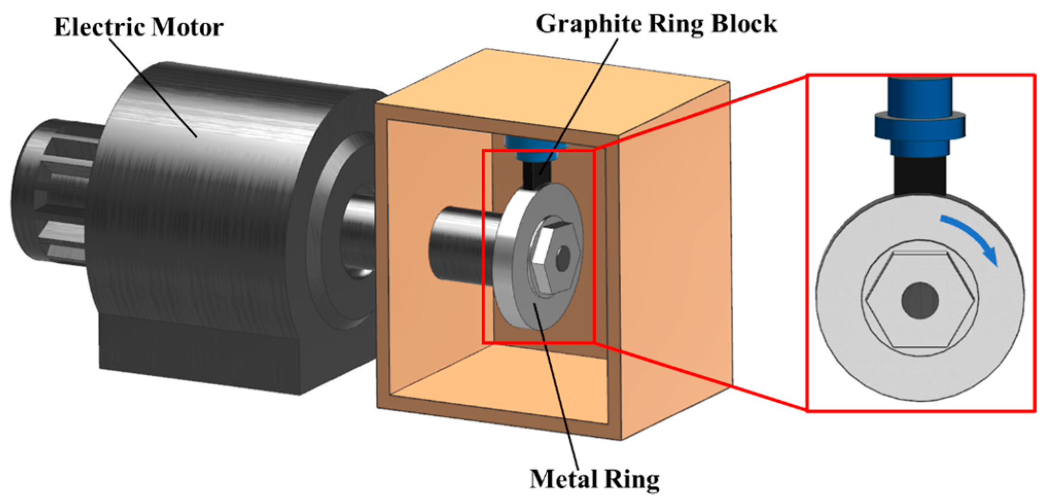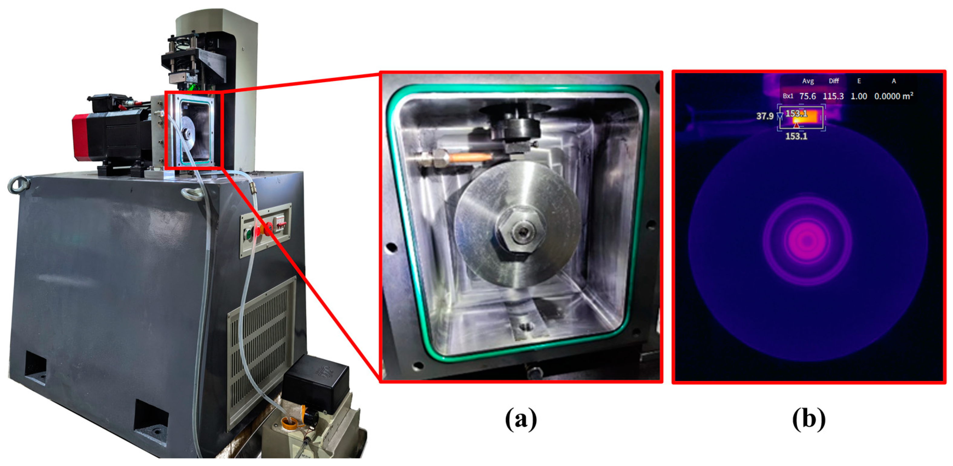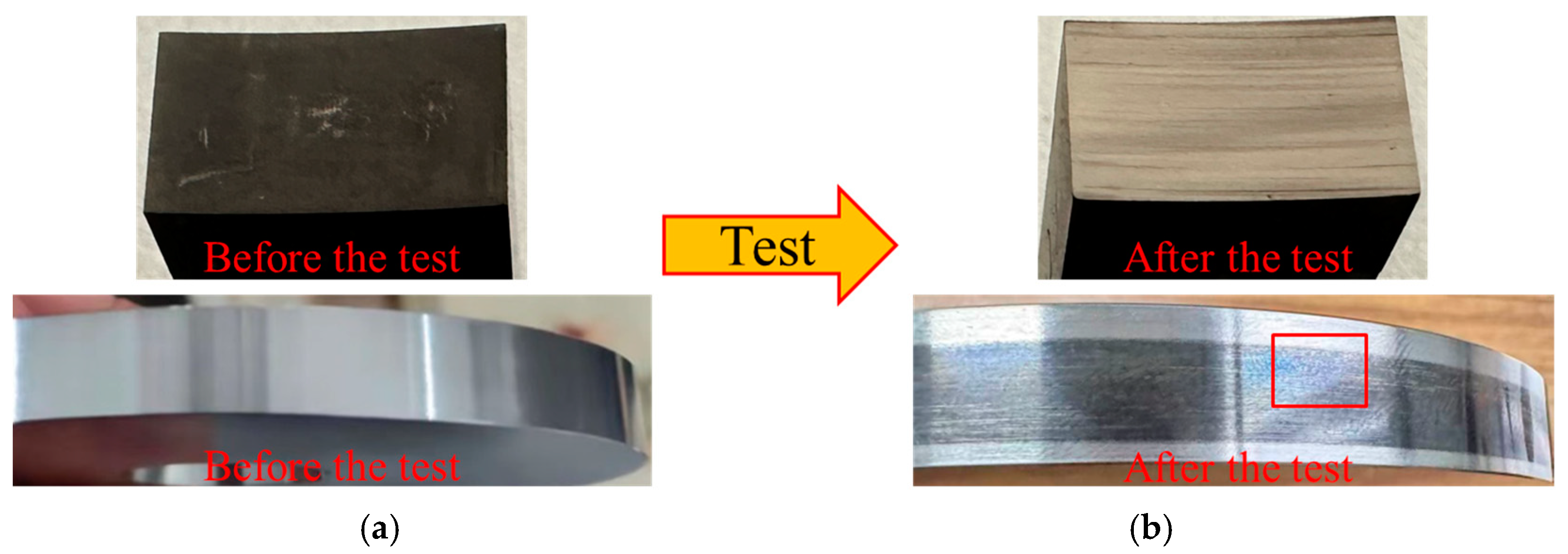 Figure 5, and was equipped with corresponding measurement and detection equipment. The high-speed ring-block friction and wear test bench could simulate the actual working state of the sample under the action of high speed and force load and study the high-speed friction and wear process of graphite ring-blocks under real working conditions, and at the same time, the control end of the test bench could output result parameters such as the friction coefficient and friction force. Through the thermal imager, the change in temperature with time was recorded for the analysis of the law and mechanism after the test.