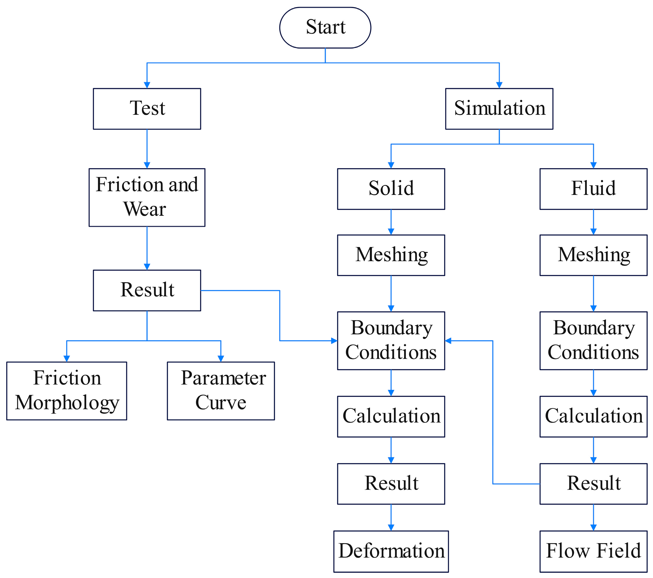 Figure 6. Firstly, through friction and wear tests, the surface friction and wear morphology and wear rate of the graphite material were obtained. Then, the parameters such as the friction coefficient, friction force, and temperature in the tests were plotted and analyzed in accordance with the rules. The fluid in the sealed gap was simulated and calculated through fluent to analyze the flow field characteristics. By combining the friction force and temperature obtained from the friction test, as well as the temperature and pressure calculated from the fluid, with the solid-domain analysis, the thermal–solid coupling and thermo-fluid–solid coupling calculations were carried out to obtain the deformation characteristics of the graphite ring segment, which intuitively reflected the harm of friction wear and frictional heat generation to the segmented annular seal. Finally, the structure of the segmented annular seal was optimized by designing pocket and micro-textures, and simulation calculations of the sealing fluid were carried out. The leakage volume and hydrodynamic pressure were analyzed to determine the optimization results, and the optimization theory was summarized.