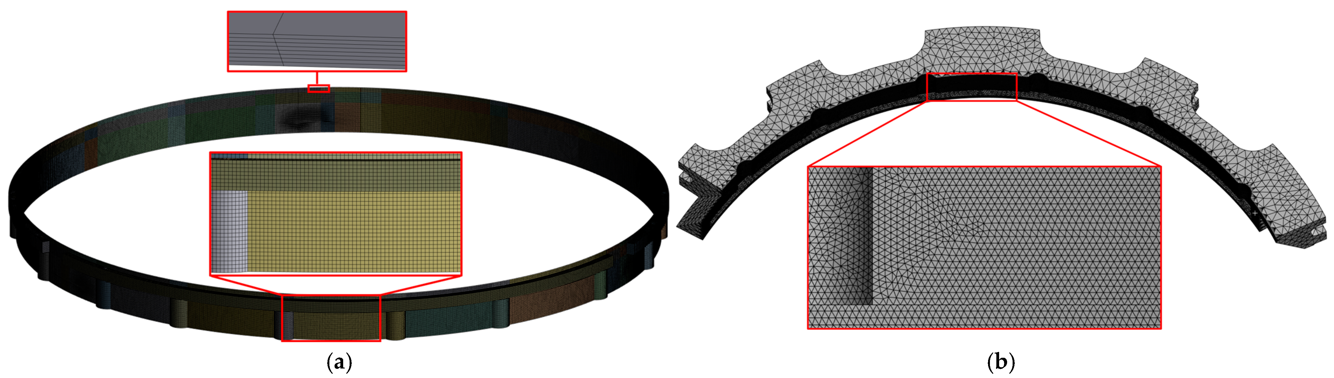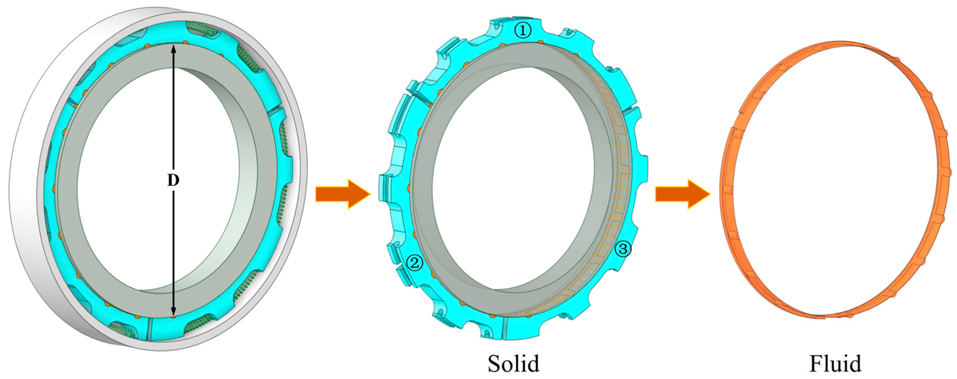 Table 3. Based on this model, solid-state-domain analysis, flow field analysis and structural optimization design were carried out. The solid domain is the gap between the rotor and the sealing ring, and the fluid domain is the main sealing fluid gap. The key research objects of this paper include the flow field characteristics of the main seal of the segmented annular seal, and thus the fluid gap at the lap joint of the ring segments is ignored.
