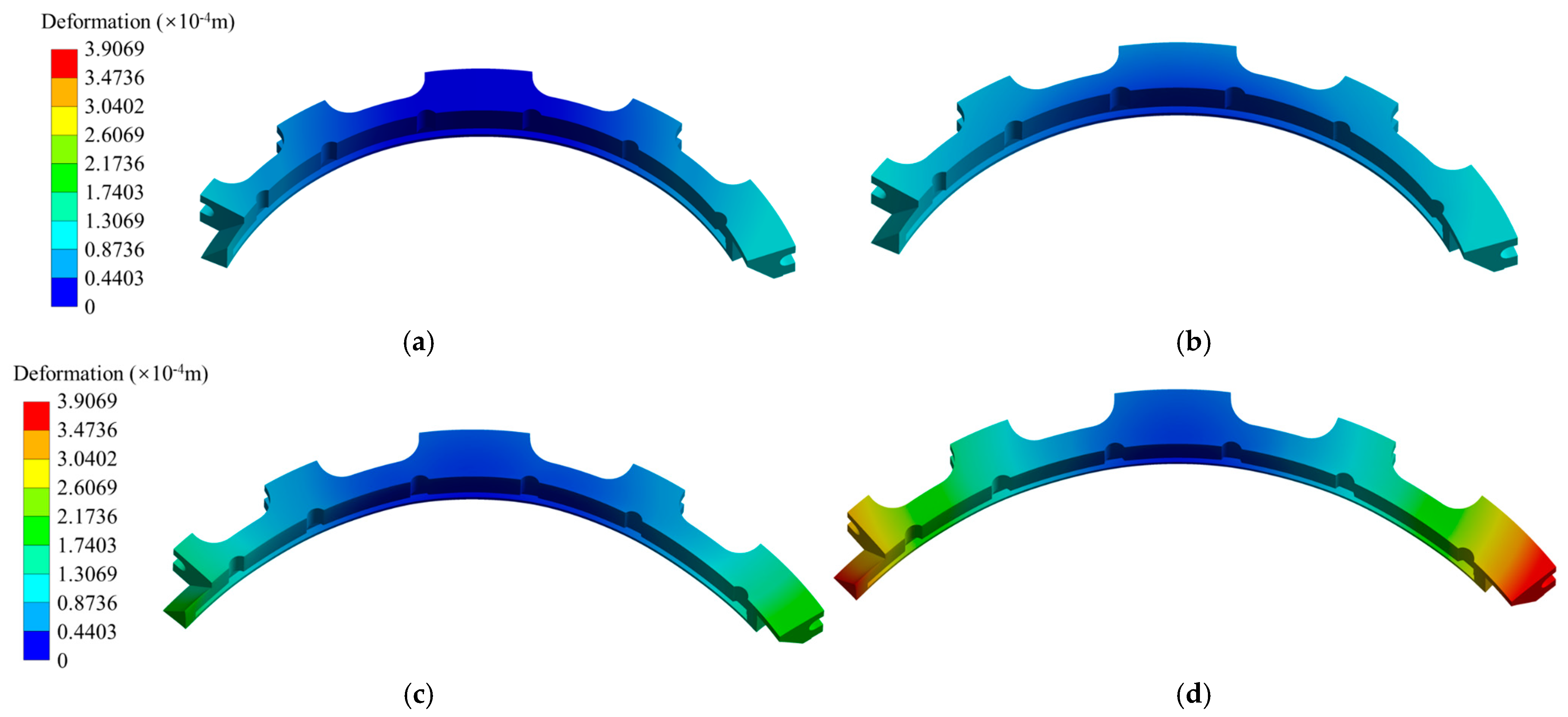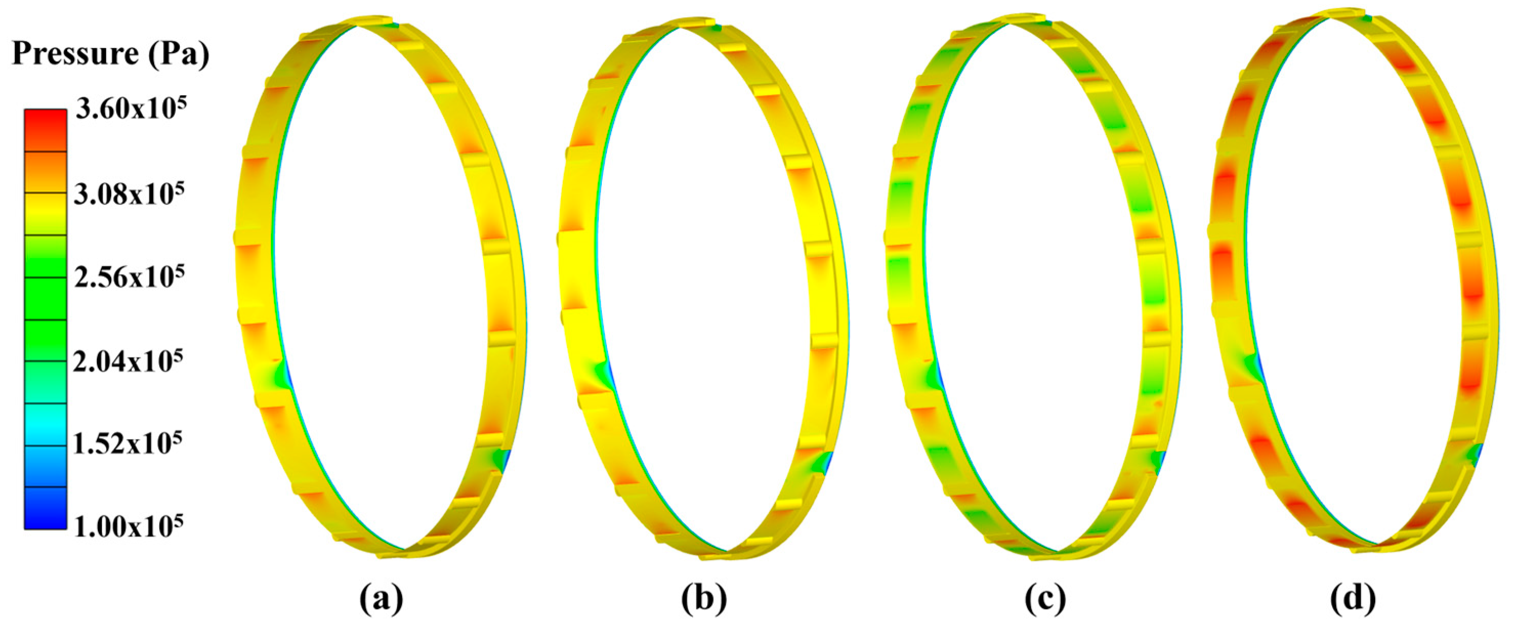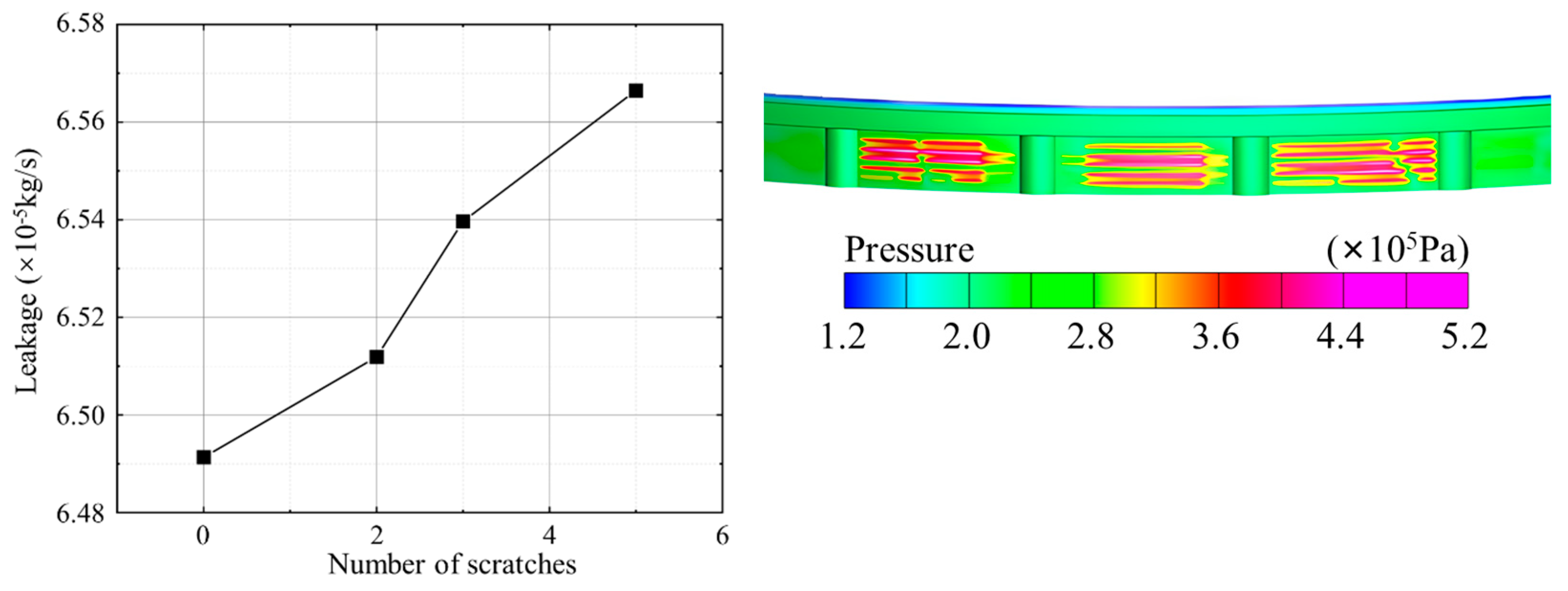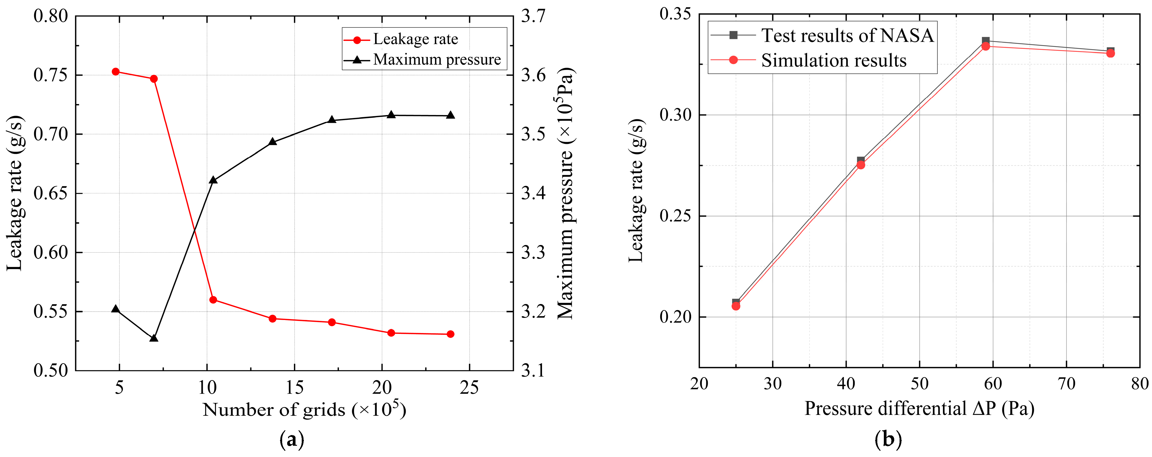 Figure 9b shows the comparison of the leakage in the fluid domain of the segmented annular seal at a rotational speed of 500 revolutions per second (rps) and pressure differences of 0.25 MPa, 0.42 MPa, 0.59 MPa, and 0.76 MPa, respectively, with the data in reference [