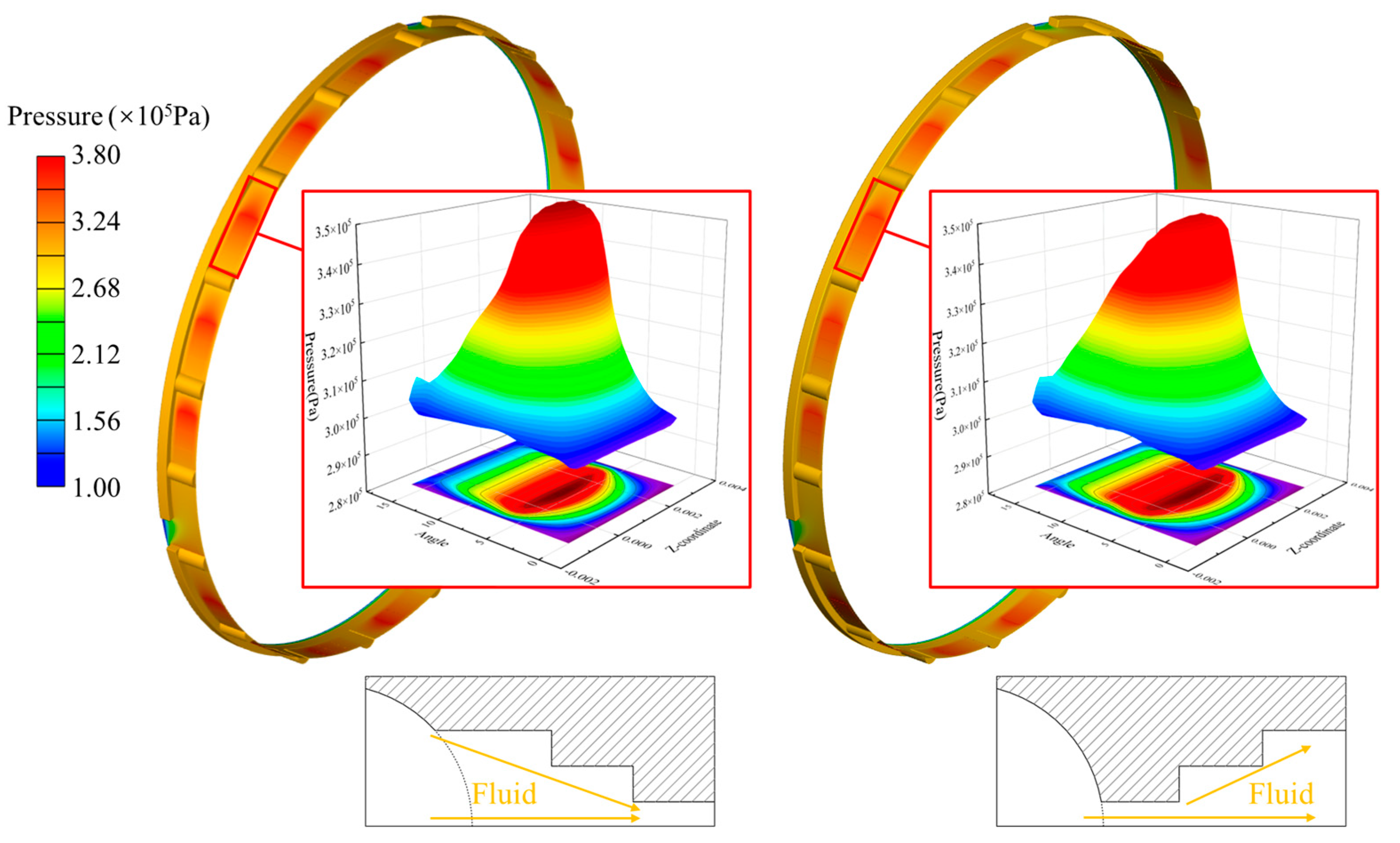 5]. However, the friction and wear problem during the opening process of the segmented annular seal objectively exists, which affects the service life of the sealing structure and leads to its failure. Scholars have proposed that the dynamic pressure segmented annular seal with shallow grooves on the inner surface of the ring segment can enhance the hydrodynamic pressure effect, thereby improving the overall opening performance of the split float ring seal, enabling the fluid dynamic seal to form as soon as possible, and thus reducing the high-speed friction and wear caused by the contact between the ring segment and the rotor [