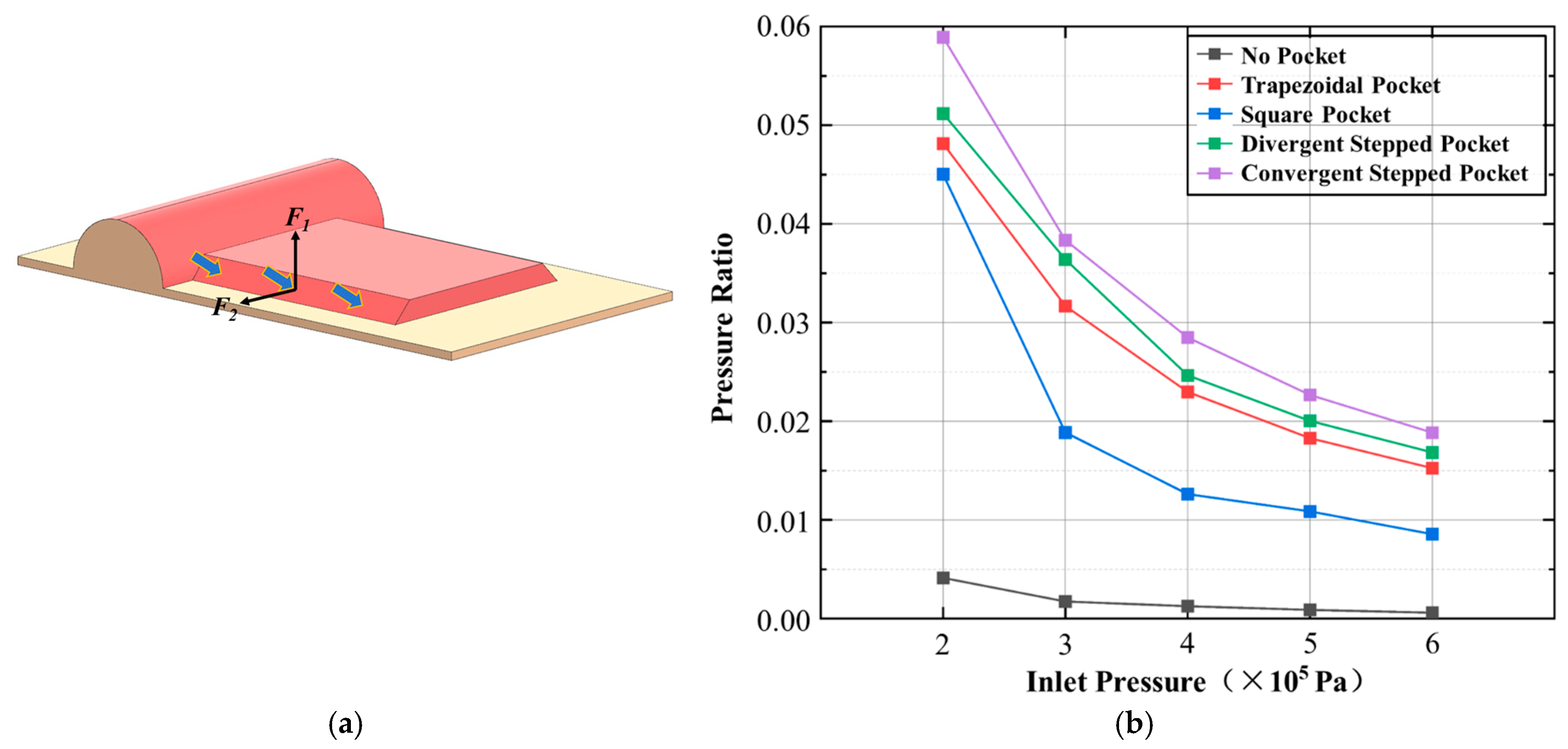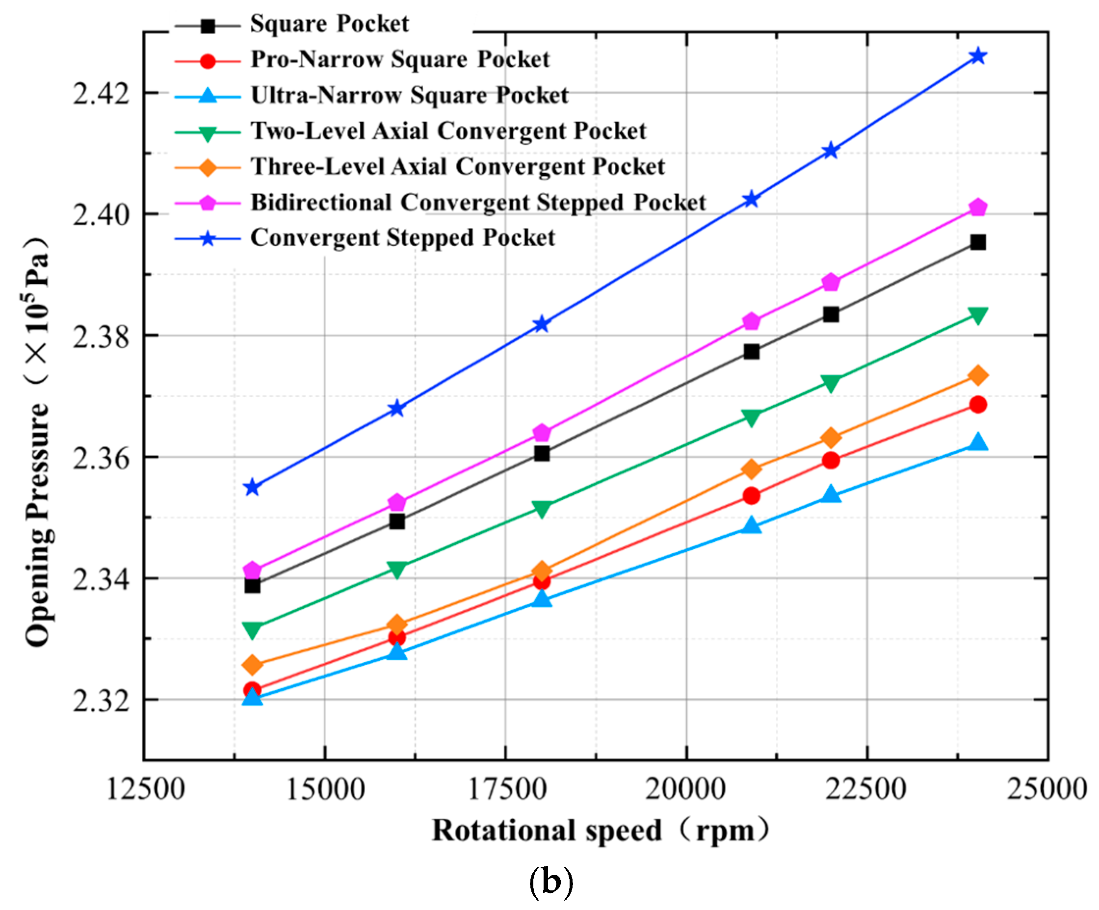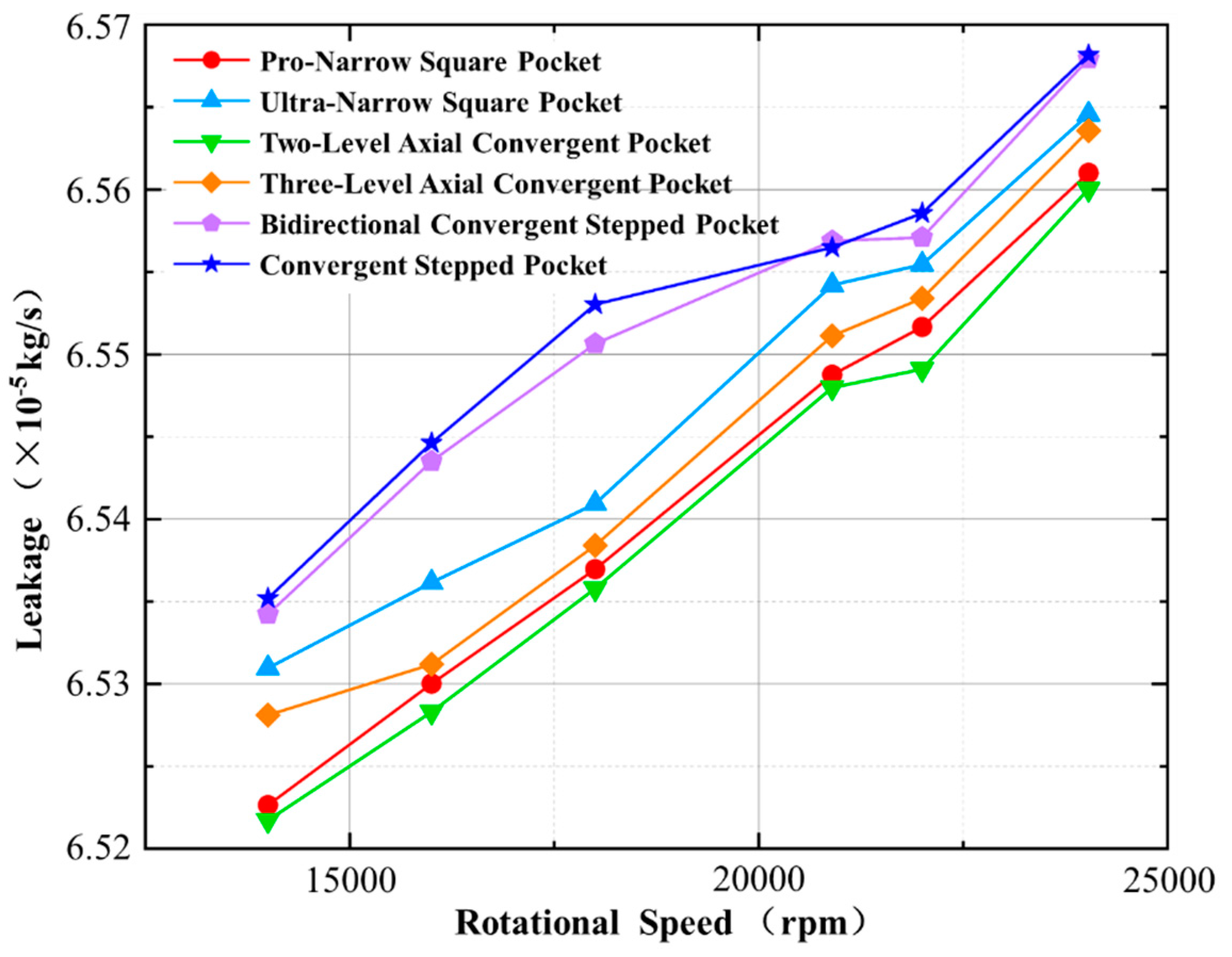 Figure 9a. With the change in the number of grids, the leakage rate and the maximum pressure tend to stabilize. At this point, the total number of grids is determined to be 2 million. The calculation results are relatively accurate, with less waste of computing power and high calculation efficiency. At the same time, the thickness of the air film is determined to be encrypted by 7 layers. In subsequent calculations, the fluid domain in the pocket needs to be encrypted to 5 layers to ensure the accuracy of the calculation.
