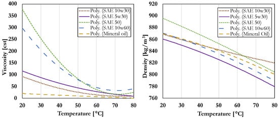 Density values were obtained from the manufacturers’ technical data sheets, which report experimentally measured properties for each lubricant. Polynomial regression was then applied to model the density–temperature behavior (Figure 2, right). Similarly, viscosity index and pressure–viscosity coefficient values were extracted from the corresponding technical data sheets. Table 1 summarizes the lubricants and their associated properties.