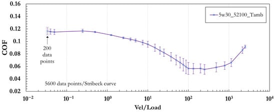Experimentally measured Stribeck curve for SAE 5W-30 oil at ambient temperature using 52100 chrome steel balls. The coefficient of friction was measured across 28 speed–load combinations, with 200 data points collected per condition from four repeated tests (totaling 5600 data points). Error bars represent one standard error (n = 200) for each operating condition.