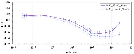 A comprehensive family of Stribeck curves was collected for each lubricant during the data collection phase. Figure 7 illustrates the variations in Stribeck behavior observed for 5W30 oil using different ball materials and testing temperatures.