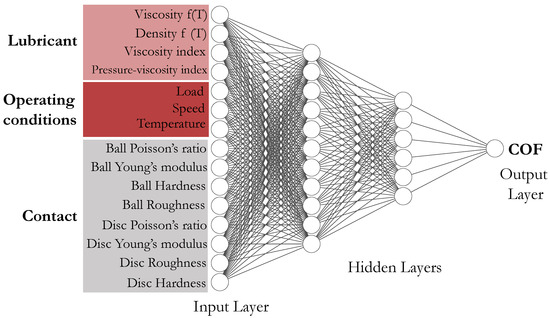 A Multilayer Perceptron (MLP) deep learning model is trained to process input variables and predict the COF based on the tribosystem features. An MLP is a type of feedforward artificial neural network consisting of an input layer, one or more hidden layers, and an output layer, with each layer comprising fully interconnected neurons. Figure 8 illustrates the general architecture of the current tribosystem’s NN. Although a single hidden layer is often sufficient for many problems, the complex, nonlinear behavior of COF necessitates the use of at least two or three hidden layers to capture intricate patterns in the data.