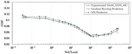 Experimental and NN-predicted Stribeck curves of SAE 10W-60 at 40 °C using a 52100 chrome steel ball. SAE 10W-60 was unseen during training, demonstrating the model’s generalization capability. For this case, the MAE, RMSE, MAPE, and between predicted and experimental COF values are 0.0028, 0.0036, 3.7%, and 0.97, respectively.