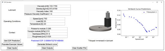 To facilitate the practical application of the trained model, a graphical user interface (GUI) was developed to provide a user-friendly platform for model deployment. This GUI integrates the machine learning model, enabling users to predict the COF based on specified operating conditions, material properties, and lubricant characteristics. In addition to COF predictions, the GUI generates the corresponding Stribeck curve for the selected tribosystem, offering insights across various speeds and loads to cover the entire friction regime.