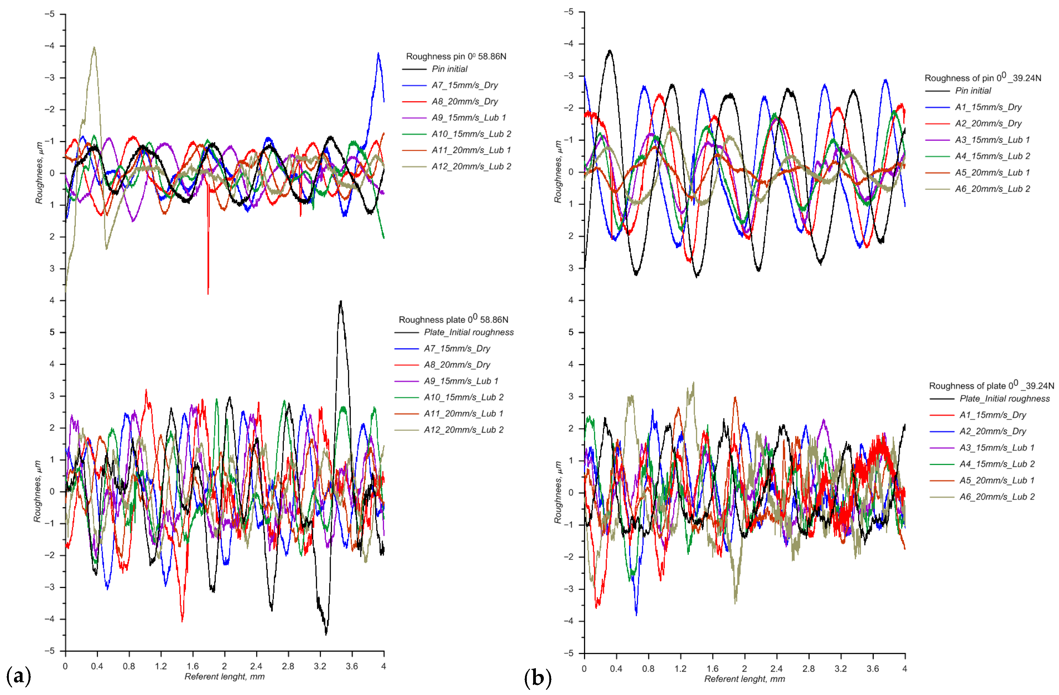 The initial roughness measurements demonstrated strong anisotropy, with the 45° orientation showing smoother longitudinal filament alignment, while 0° and 90° presented more pronounced transverse features. After testing, 45° and 90° samples exhibited mostly plastic smoothing, whereas 0° samples developed clear wear tracks and asperity removal, in agreement with adhesive and mild abrasive mechanisms. These trends correlate with prior findings that surface orientation controls asperity interlocking and debris formation in FFF parts.