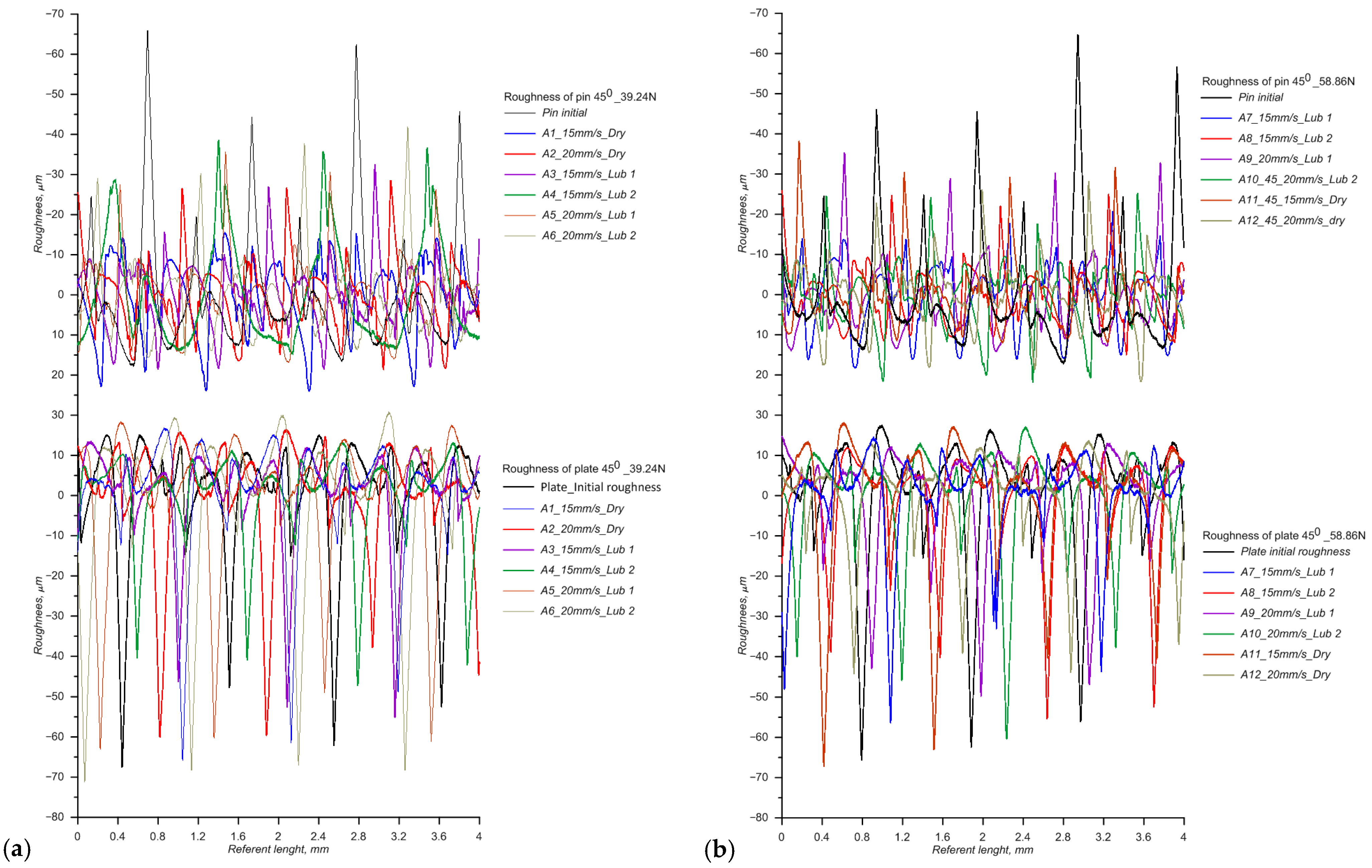 In the case of the 45° orientation, a combination of longitudinal shearing and transverse cutting of asperity peaks occurs, but much less than expected. This means that the 45° orientation represents the geometry with the largest surface transformation of asperities and the most pronounced plastic deformation. Lubricants have the strongest effect in this orientation, as the viscosity and shear-thinning behavior of the applied lubricants facilitate easier filling of surface irregularities, especially under higher normal loads.