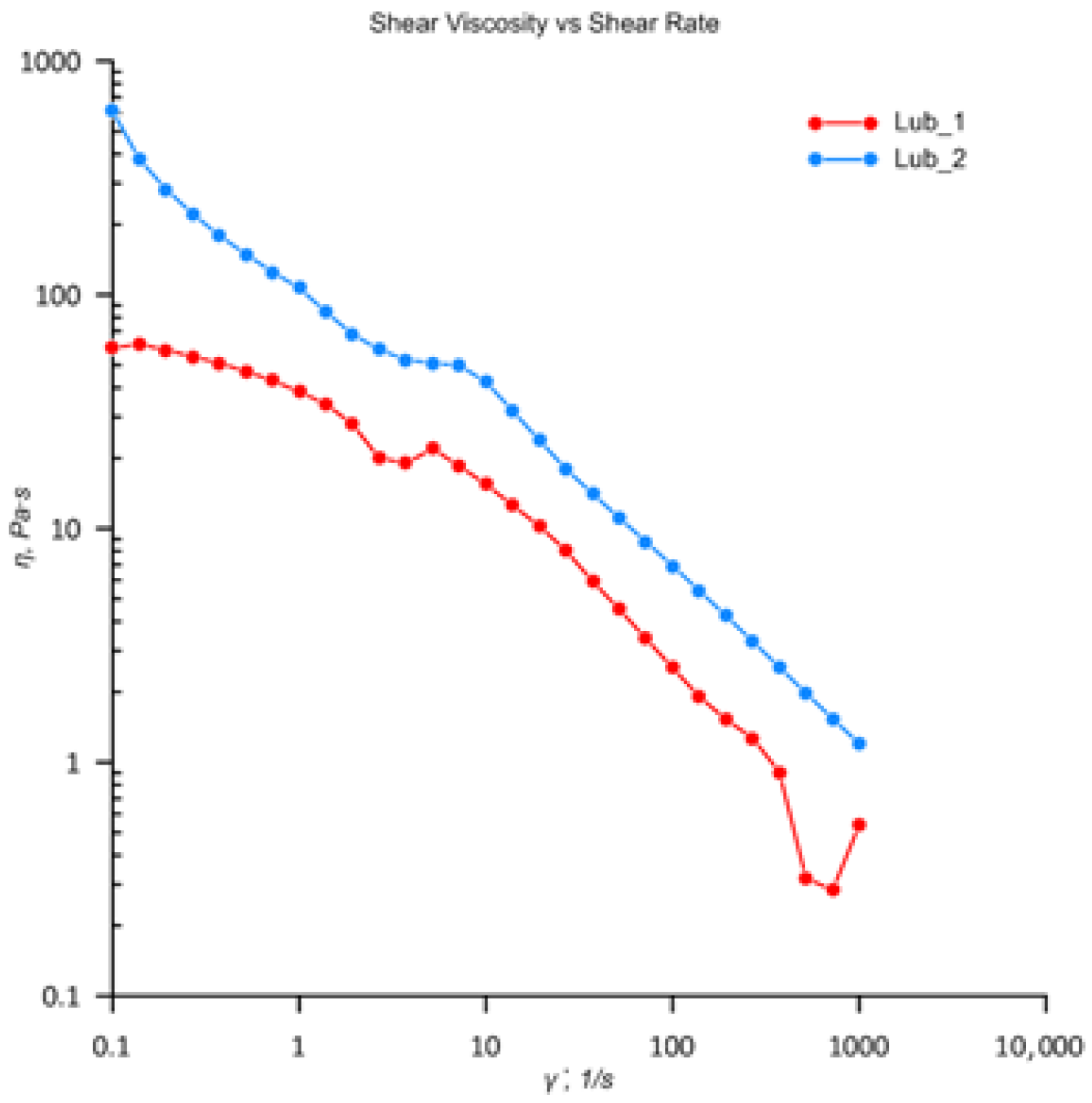 Rheological characterization of both lubricants was conducted at a temperature of 22 °C to determine their temperature-dependent viscosity and resistance to flow under applied shear. The rheological analysis of the lubricants was carried out using an Anton Paar MCR 102e rotational rheometer (