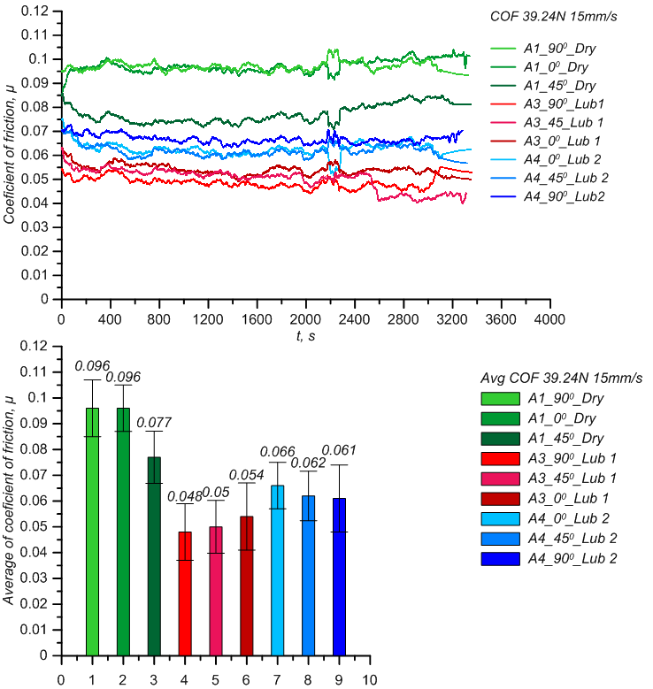 The 45° orientation consistently provided the lowest COF in most regimes (except 58.86 N on the 15 mm/s regime), due to minimized asperity interference and favorable lubricant entrainment pathways.