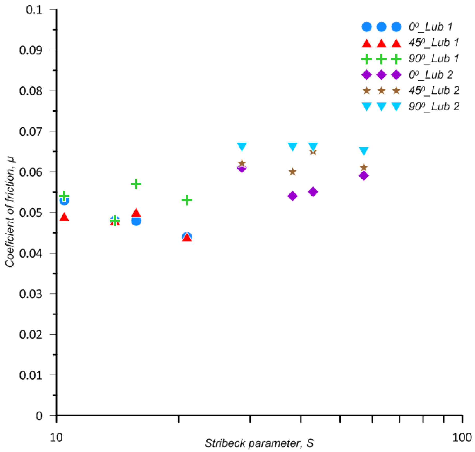 The 90° orientation shifted Stribeck curves downward, indicating improved film formation and reduced friction.