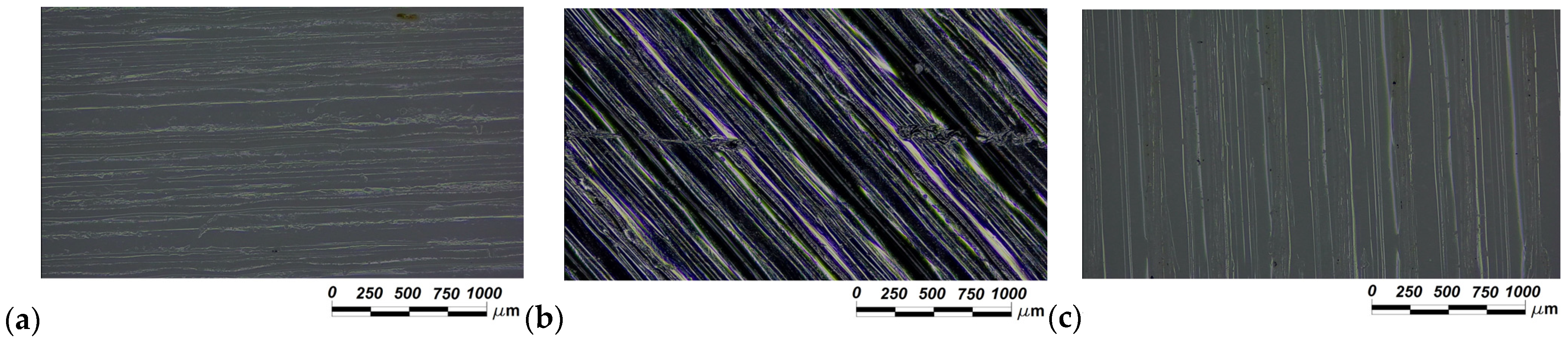 The comparative analysis of surface roughness for all tested orientations, 90°, 45°, and 0°, clearly shows that the microstructure formed during FFF printing has a decisive influence on how surface topography evolves during reciprocating sliding. For the 0° orientation, where the filament paths are parallel to the sliding direction, the dominant mechanisms are shear and micro-grooving. Although the lubricants fill micro-depressions, the surface still exhibits pronounced Rv values due to sliding along continuous ridges. In this regard, the 0° orientation can be considered the most sensitive to the development of short-wavelength micro-roughness, even though the global geometry remains stable.