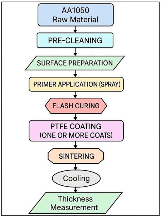 AA1050 samples were coated with a commercial PTFE on the same industrial coating line in order to obtain a nominal dry film thickness of approximately 15 µm under identical conditions for all texture variants and for the non-textured reference surface (Figure 1). The coating procedure followed a conventional PTFE process route including degreasing, surface inspection, primer application, flash curing, PTFE topcoat deposition, sintering, and final quality control. This ensured that the only systematic variable in the study was the laser generated surface topography of the aluminum substrate.
