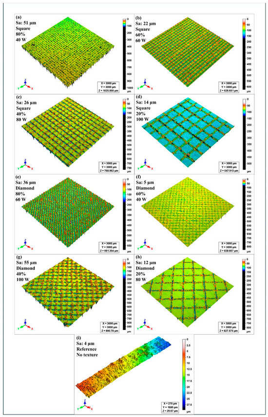 In Figure 4, optical micrographs of the 10× mag views for the different conditions further attest to the Sa trends inferred from the profilometry plots. In Figure 4a (square, 80%, 40 W), the surface is crowded with laser-influenced texture and characteristic re-deposited debris and mill-scale height variations characteristic of the highest square Sa of 51 µm. In Figure 4b (square, 60%, 60 W), the texture is continuous with a more regular and less debris-filled pattern in comparison with Figure 4a, consistent with the lower Sa of 22 µm. In Figure 4c (square, 40%, 80 W), a more defined square Arris pattern exists with marked track crossings and ridged sides reflecting an intermediate Sa of 26 µm, signifying more marked height variation, yet restricted spatial density of the surface features, like in Figure 4a. In Figure 4d (square, 20%, 100 W), large plateaus and a sparse textured boundary frame occur with a consequent lowered height dispersion Sa of 14 µm, despite the increase in power input; this indicates a processed area restriction tending to reduce the prominence of characteristic floor and summit topography in the height dispersion metric. In the diamond textures, in Figure 4e (diamond, 80%, 60 W), there is a crowded diagonal ribbing with frequent peripheral re-forming of the topographic summits, signifying the high Sa of 36 µm. In Figure 4f (diamond, 60%, 40 W), the diamond geometry is more refined with a dearth of topographic summits, yet limited summital build-up with a more continuous summit area signifying the near-standard Sa of 5 µm. In this image, the diagonal pattern is rawer with deeper and darker topographic ribs with adequate summital buildup and the summit–depression contrast signifying the maximum Sa of either the square or the diamond sa of 55 µm. In Figure 4h (diamond, 20%, 80 W), the topographic area is large, and the summit regions are continuous, yet with maintained topographic ribbing, signifying a moderate Sa of 12 µm. In image Figure 4i (reference), machining induced directional markings from the original workpiece topography with no regular summital topographic cavities occur, signifying the lowest Sa of 4 µm and confirming the prior observations of Sa for the processed surfaces. Figure 4a–h result from laser texturing rather than baseline surface preparation.