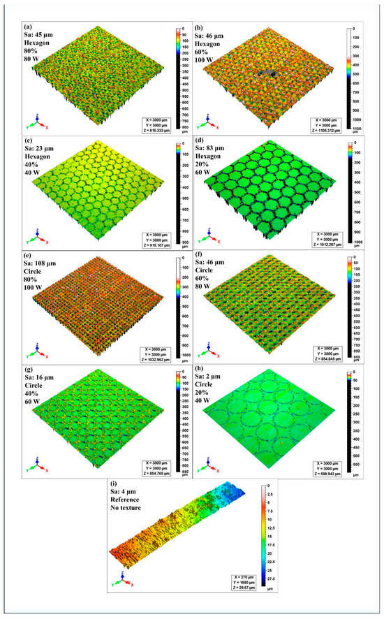 Across Figure 3, the untextured reference surface in Figure 3i exhibits a low Sa of 4 µm, whereas all the laser-textured conditions modify the areal height distribution to different extents depending on the geometry, scanned area, and power. For the hexagon pattern, Sa is 45 µm in Figure 3a at 80% scanned area and 80 W, remains similarly high at 46 µm in Figure 3b at 60% and 100 W, decreases to 23 µm in Figure 3c at 40% and 40 W, and then rises sharply to 83 µm in Figure 3d at 20% and 60 W, indicating a non-monotonic coupling, where a reduced processed fraction can still generate a large Sa when the remaining features develop high rim relief and strong local height contrast. For the circle pattern, the highest roughness is obtained in Figure 3e with Sa = 108 µm at 80% and 100 W; then, Sa drops to 46 µm in Figure 3f at 60% and 80 W and to 16 µm in Figure 3g at 40% and 60 W, while Figure 3h at 20% and 40 W yields Sa = 2 µm, which is comparable to and slightly below the reference in Figure 3i, consistent with a plateau dominated surface, where the limited areal contribution of textured depressions does not significantly broaden the overall height distribution.