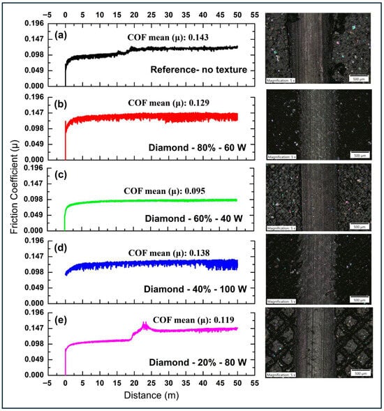 Effect of laser diamond texturing parameters on COF values at 20 N, 1 Hz, and 50 m wear tests: (a) reference (no texture); (b) diamond 80% scanned area, 60 W laser power; (c) diamond 60% scanned area, 40 W laser power; (d) diamond 40% scanned area, 100 W laser power; (e) diamond 20% scanned area, 80 W laser power.