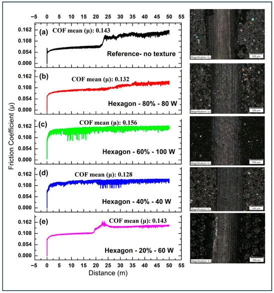 Effect of laser hexagon texturing parameters on COF values at 20 N, 1 Hz, and 50 m wear tests: (a) reference (no texture); (b) hexagon 80% scanned area, 80 W laser power; (c) hexagon 60% scanned area, 100 W laser power; (d) hexagon 40% scanned area, 40 W laser power; (e) hexagon 20% scanned area, 60 W laser power.