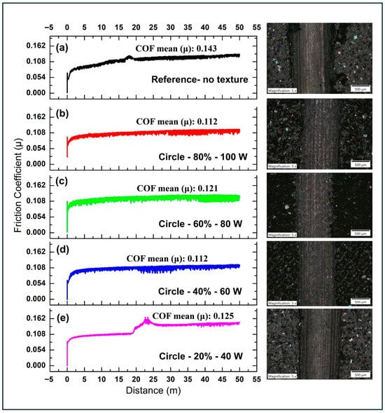 Effect of laser circle texturing parameters on COF values at 20 N, 1 Hz, and 50 m wear tests: (a) reference (no texture); (b) circle 80% scanned area, 100 W laser power; (c) circle 60% scanned area, 80 W laser power; (d) circle 40% scanned area, 60 W laser power; (e) circle 20% scanned area, 40 W laser power.