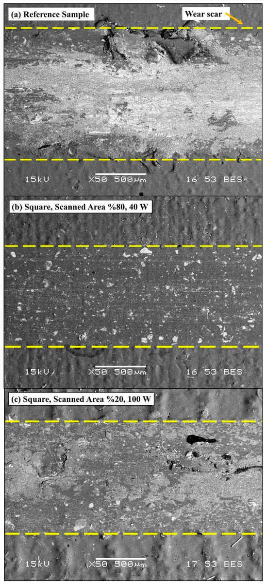 The SEM picture of the reference sample (Figure 12a) reveals a continuous and relatively smooth contact area with significant smearing of the PTFE layer in the direction of the motion. Also visible are the localized microcracks and flattened areas on the contact area. These are an indication of the continuous plastic flow on the polymeric layer. This is due to the absence of surface topography on the counterpart surface that would have helped in trapping debris. This is shown in the third-body abrasion on the polymeric layer. This correlates with the high coefficients of friction shown for the respective samples. For the square texture sample (80% scanned area, 40 W), the wear track, circumscribed by fully existing square microcavities, is observed to be reasonably confined and narrow (Figure 12b). The PTFE coating is also reasonably continuous in the wear track, with very little cracking. The small debris is selectively trapped inside the square dimples, thus suppressing abrasive action in the contact region. These SEM results support the assertion that a dense square texture laser processed with a moderate laser power can significantly improve the PTFE coating longevity by virtue of debris entrapment. On the other hand, for the square-textured sample scanned with 20% of the scanned area at 100 W, the wear mark appears wider and less consistent in the SEM photograph (Figure 12c). There are local areas where delamination and consequent exposure of the substrate have occurred, as well as along the median rubbing track. This is because the large pitch between square features forces a localized load on smooth areas, with deeper laser-ablated features also contributing to exacerbated stress concentration at the edges of ablated features, as a result of the high laser power used for ablation.