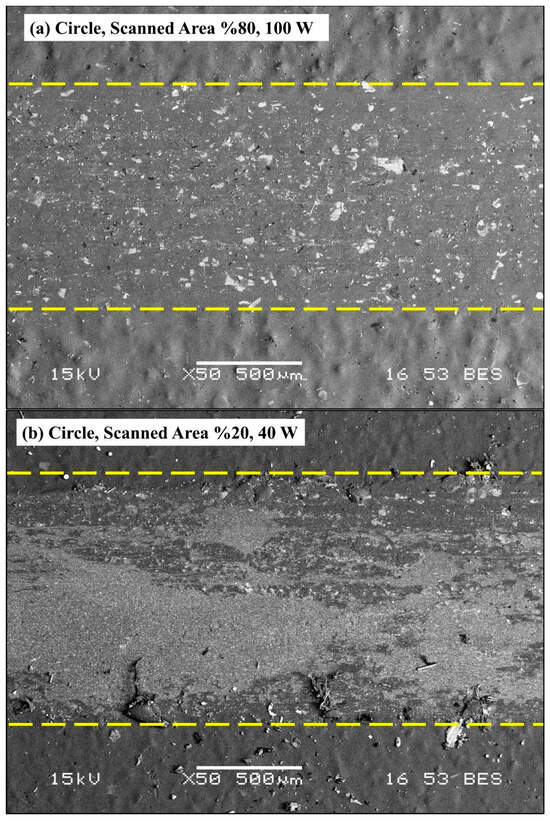 The profilometry and post-wear microscopy confirmed that the friction trends were accompanied by clear differences in coating damage evolution and wear track geometry. The untextured reference exhibited the most severe damage, with a wear-track width of approximately 1240 µm and a minimum depth of about 82 µm, while optimized textures markedly reduced the penetration and lateral spreading. For example, the square 80% scanned area and 40 W case reduced the wear track to about 930 µm width and 34 µm depth, and the Taguchi-identified diamond 60% and 40 W case yielded about 997 µm width and 39 µm depth, both far below the reference in depth and substantially improved in overall scar morphology. The SEM observations were consistent with these findings, showing that well-designed textures preserved a more continuous PTFE-coated layer and promoted debris entrapment within cavities, whereas sparse textures and/or high-power exhibited localized coating rupture and more irregular wear scars.