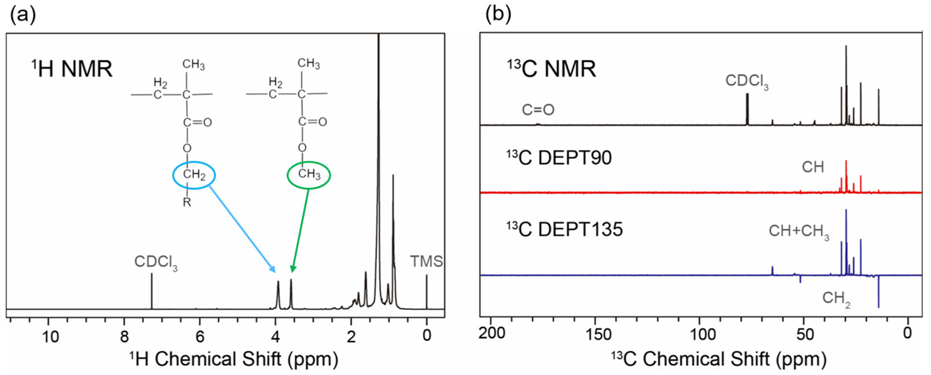Based on this pattern, the structural representation of each signal peak in the 13C NMR spectrum of PMA-2 is identified. Primary carbon (CH3) represents the terminal end of the carbon chain, secondary carbon (CH2) indicates unbranched chain extension, while tertiary carbon (CH) and quaternary carbon (C) denote branching or functionalization of the carbon chain. In the 13C spectrum, only quaternary carbon signals present in the PMA backbone and carbonyl group were observed, with no quaternary carbon signals detected in the side chains. Therefore, it can be concluded that no quaternary carbon exists in the side chains, and the degree of branching in PMA can be measured using the proportion of tertiary carbon. The branching degree of PMA-2 is 0.43%.