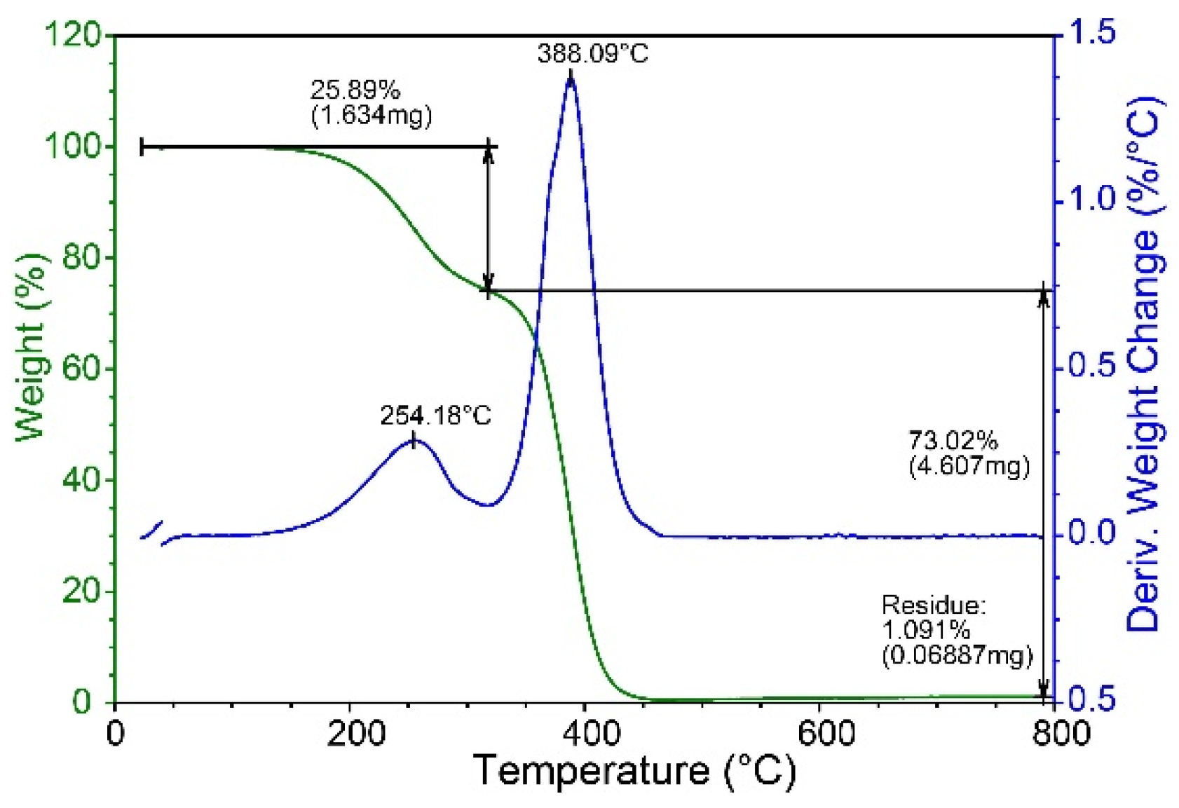 Figure 3, PMA-2 exhibits near-complete weight loss above 450 °C. Therefore, for pyGC-MS, the temperature should be set at 450 °C or higher to ensure thorough pyrolysis of the PMA sample.