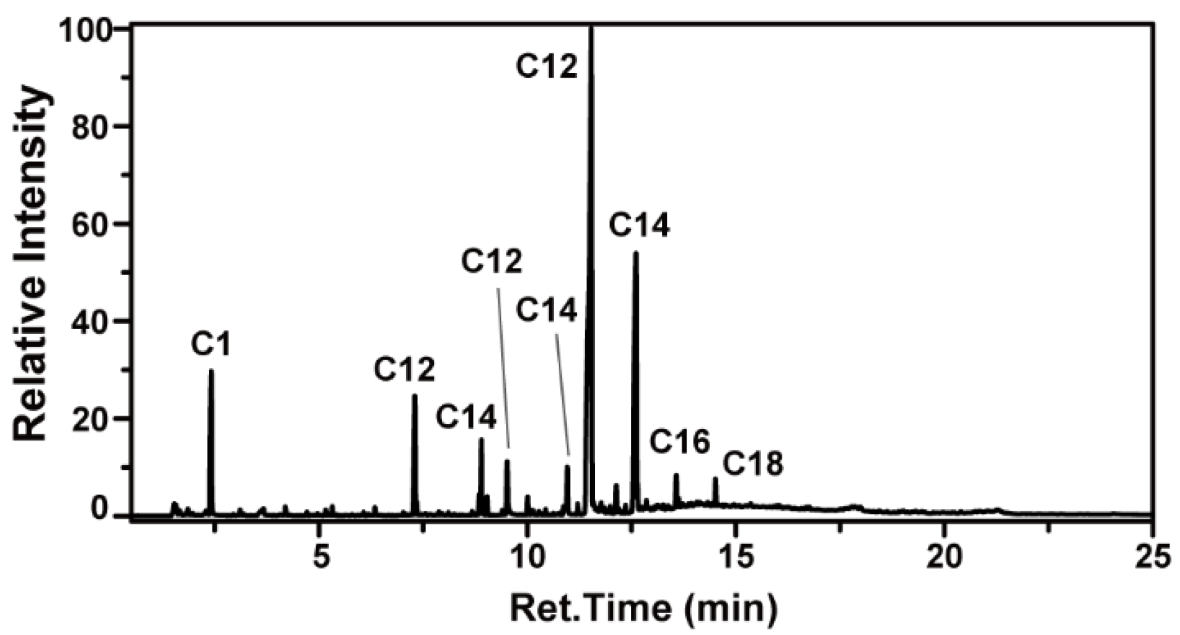 Similar to GC-MS analysis, matching the MS spectra of each component peak yields the structure and proportion of each component. The matching results contained information on methyl acrylate, dodecene, tetradecene, dodecanol, tetradecanol, dodecanol methacrylate, tetradecanol methacrylate, hexadecanol methacrylate, and octadecanol methacrylate. Among these, the alkenes correspond to the dehydration products of fatty alcohols, which may originate from the hydrolysis of ester monomers. The methacrylates represent monomer structures. In PMA-2, fatty alcohols predominantly consist of C12 and C14, accounting for up to 78%, while components with other carbon chain lengths are present in smaller quantities.