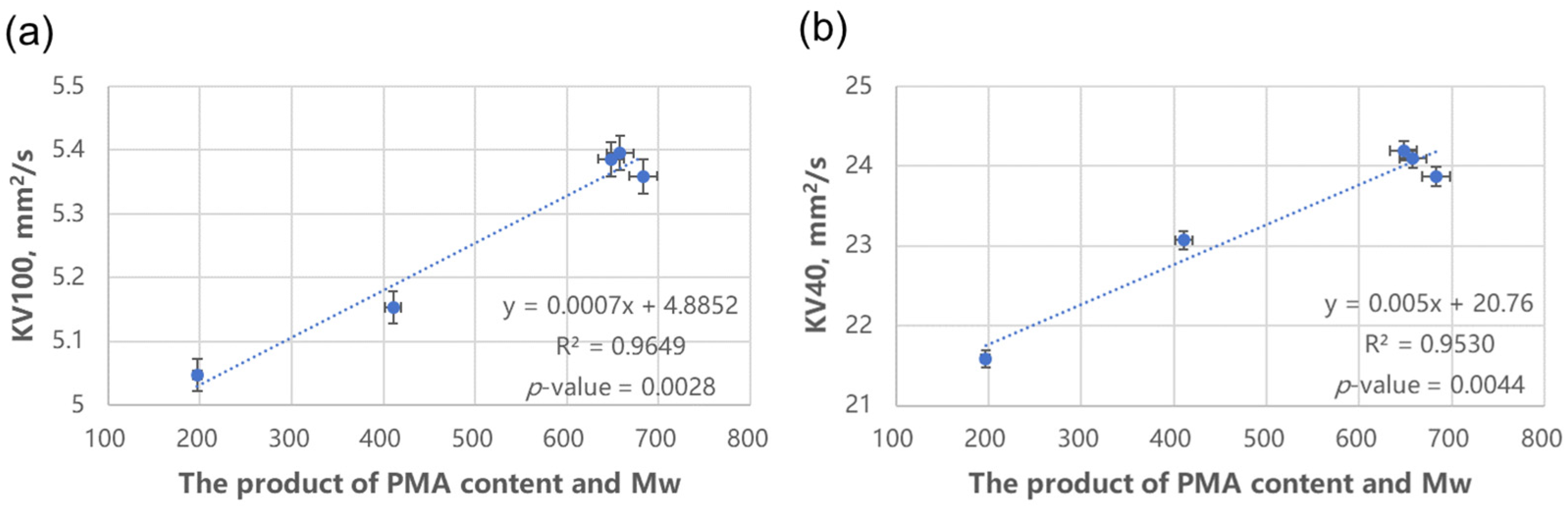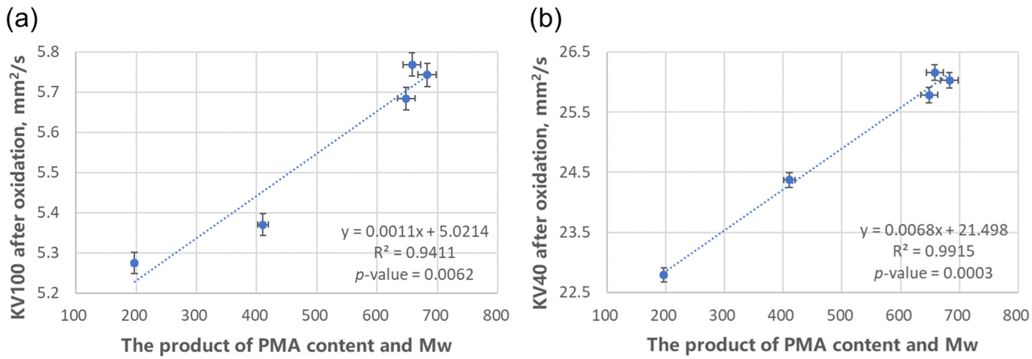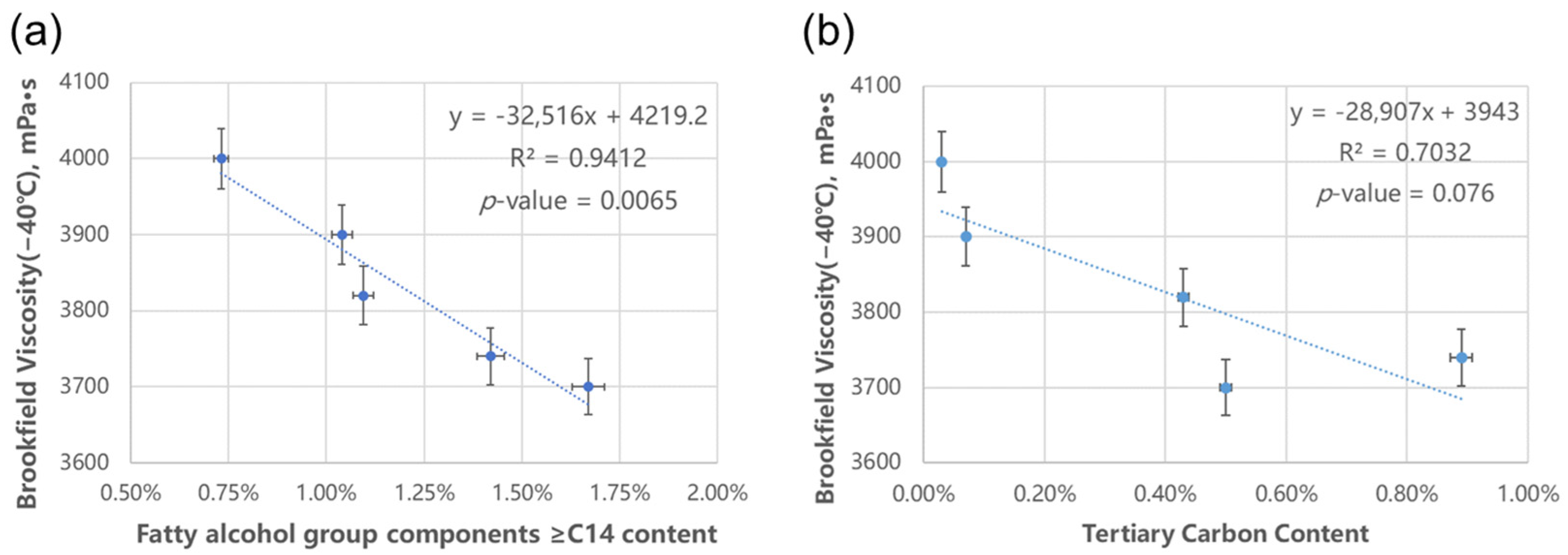 It can be observed that the low-temperature apparent viscosity (−40 °C) of the formulated oil exhibits a negative correlation with both the content of side-chain components ≥C14 in the PMA and the degree of branching (tertiary carbon content). The correlation coefficient R2 with the content of ≥C14 components reaches 0.94, and the p-value of T-test is far less than 0.05. That is, the higher the content of ≥C14 components, the more effective the PMA viscosity index improver is in optimizing the low-temperature performance of the final oil.