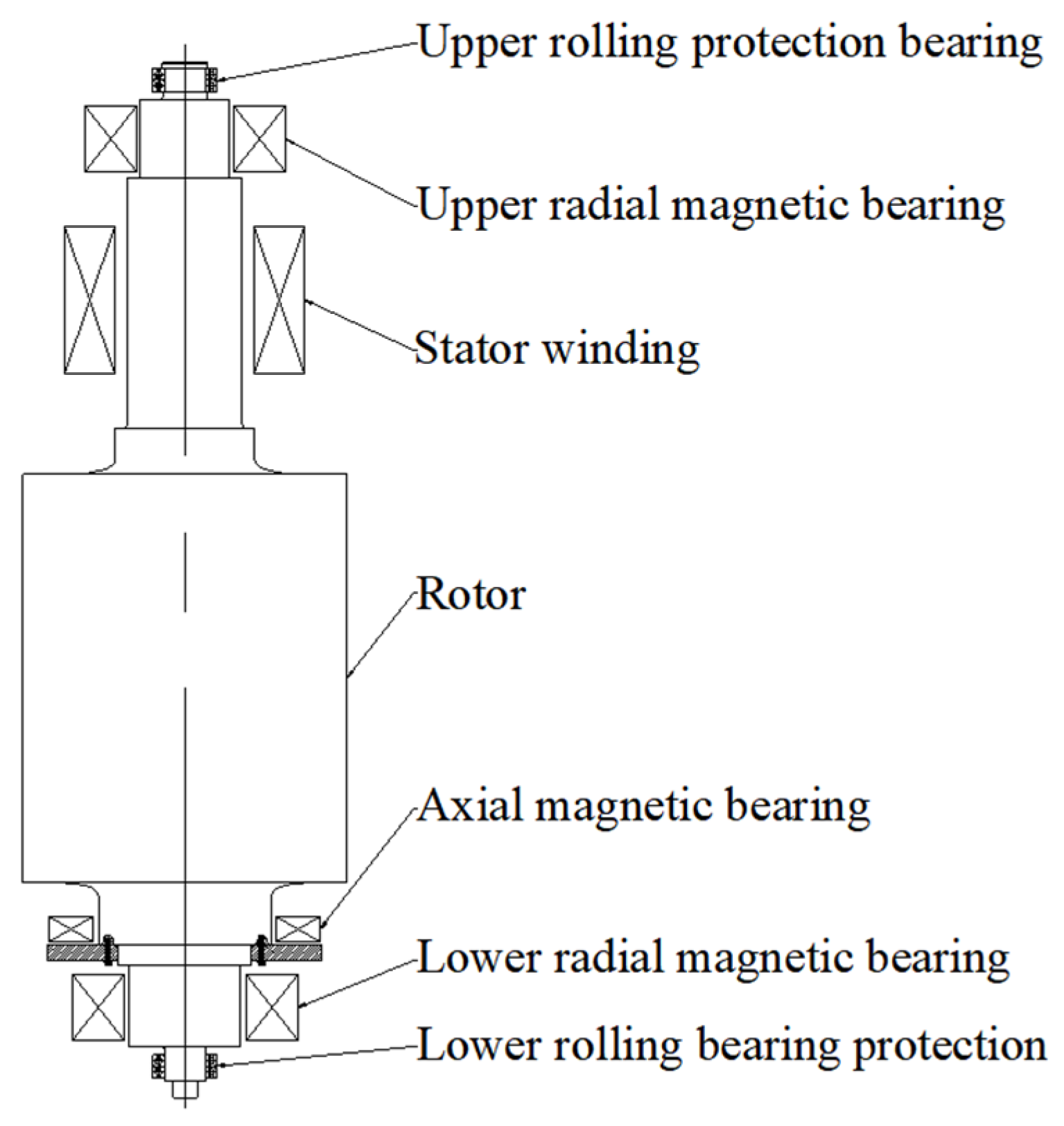 The vertical magnetic levitation rotor drop system is mainly composed of a rotor, a stator winding, upper and lower sets of radial magnetic bearings, one set of axial magnetic bearings, and upper and lower sets of rolling protection bearings (