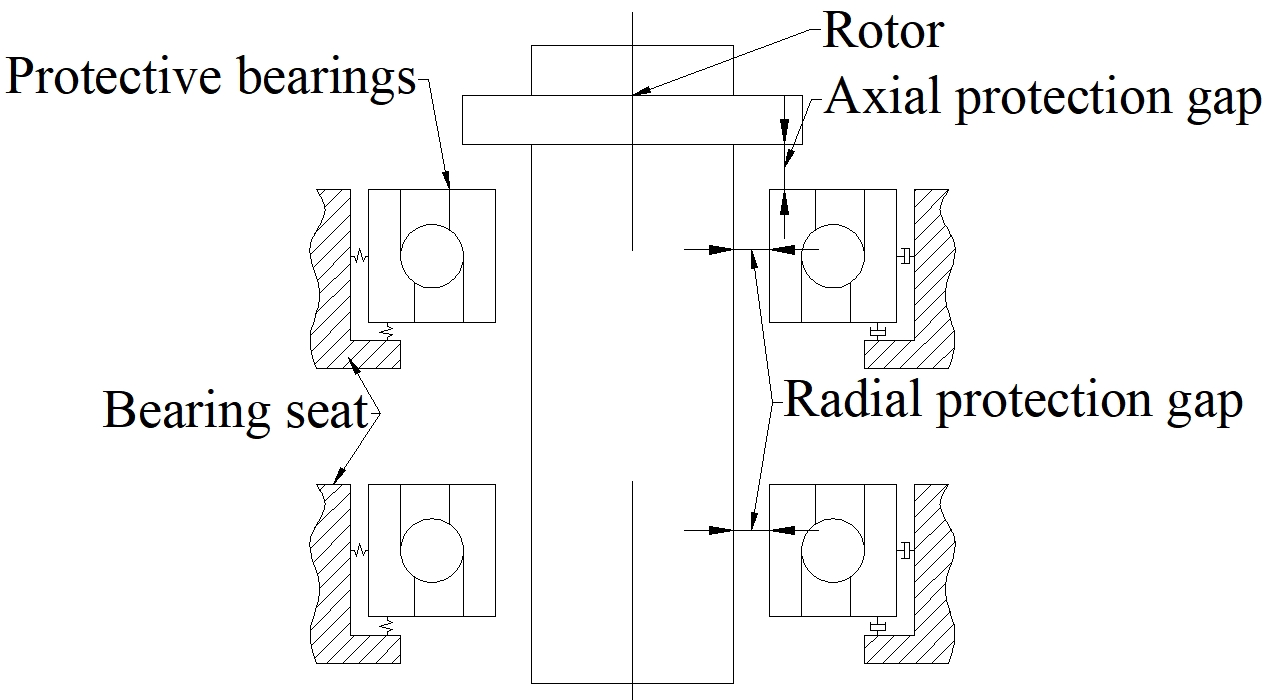Figure 1). Protective bearings are arranged at both ends of the rotor to provide mechanical support and operation protection under abnormal working conditions such as system instability or power failure. The protective bearings at both ends adopt an angular contact ball bearing structure in a “face-to-face” configuration. In the process of rotor drop, the upper protective bearing needs to bear both axial and radial loads, while the lower protective bearing mainly bears radial loads.