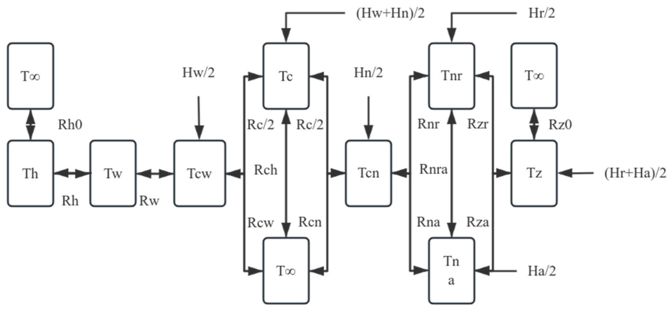 Among them, T represents temperature; R represents heat transfer impedance; the subscripts h, w, cw, c, cn, n, z, r, and a, respectively, indicate the bearing housing, the outer ring of the protection bearing, the outer ring raceway, the rolling elements, the inner ring raceway, the inner ring, the rotor, and the radial and axial directions. T∞ indicates room temperature.