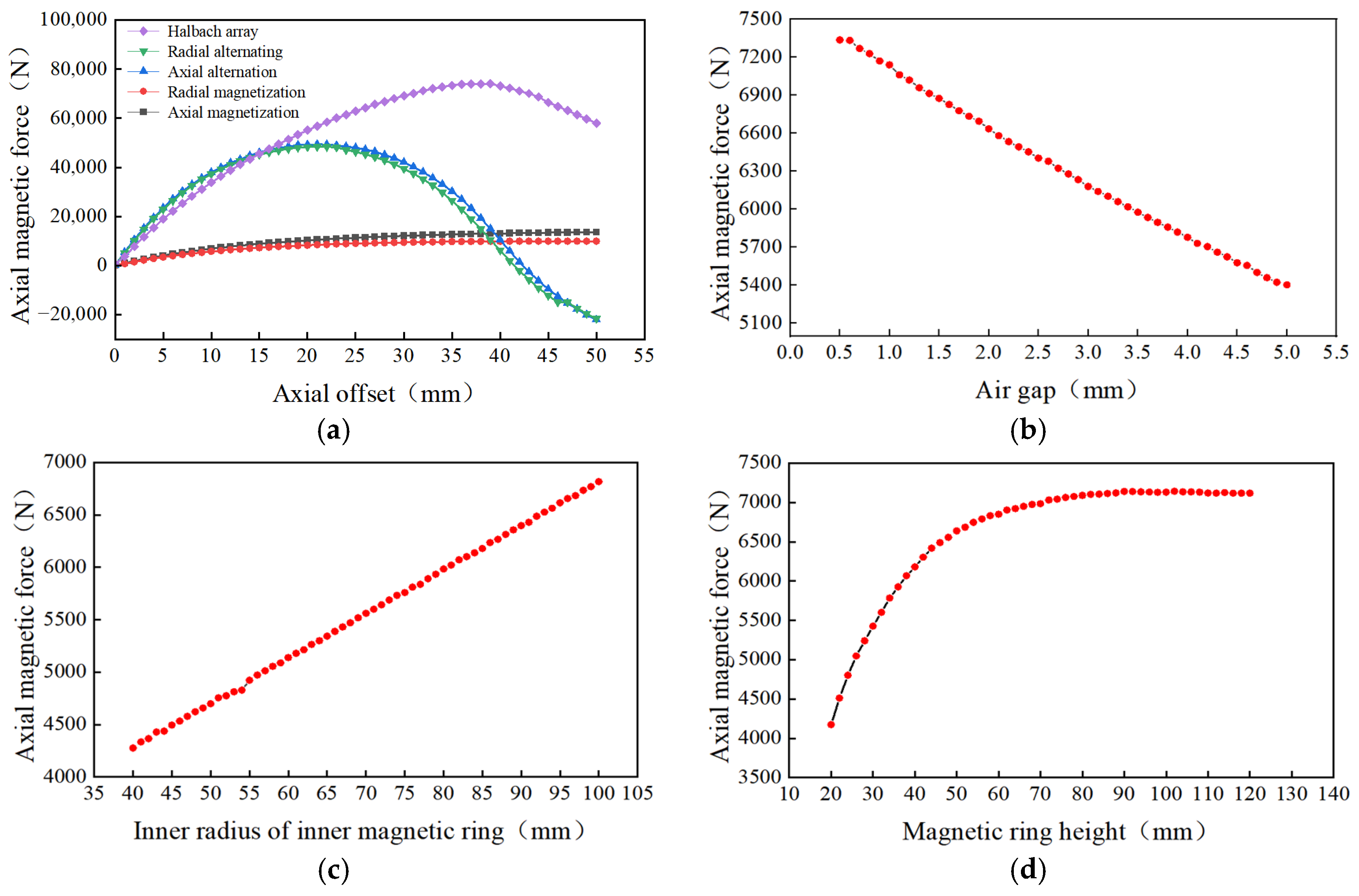 Figure 7d shows the relationship between axial magnetic force and magnetic ring height (i.e., thickness-to-height ratio). As the height increases from 20 mm to 120 mm, the axial magnetic force initially rises and then gradually stabilizes. At lower heights, increasing the height significantly boosts the axial magnetic force by enhancing the magnetic flux density in the circuit. However, beyond a certain threshold, further height increases yield diminishing returns, with the magnetic force growth rate slowing until it stabilizes. This indicates that the magnetic ring height must be optimized to balance magnetic performance, selecting an appropriate value to achieve the best magnetic output.
