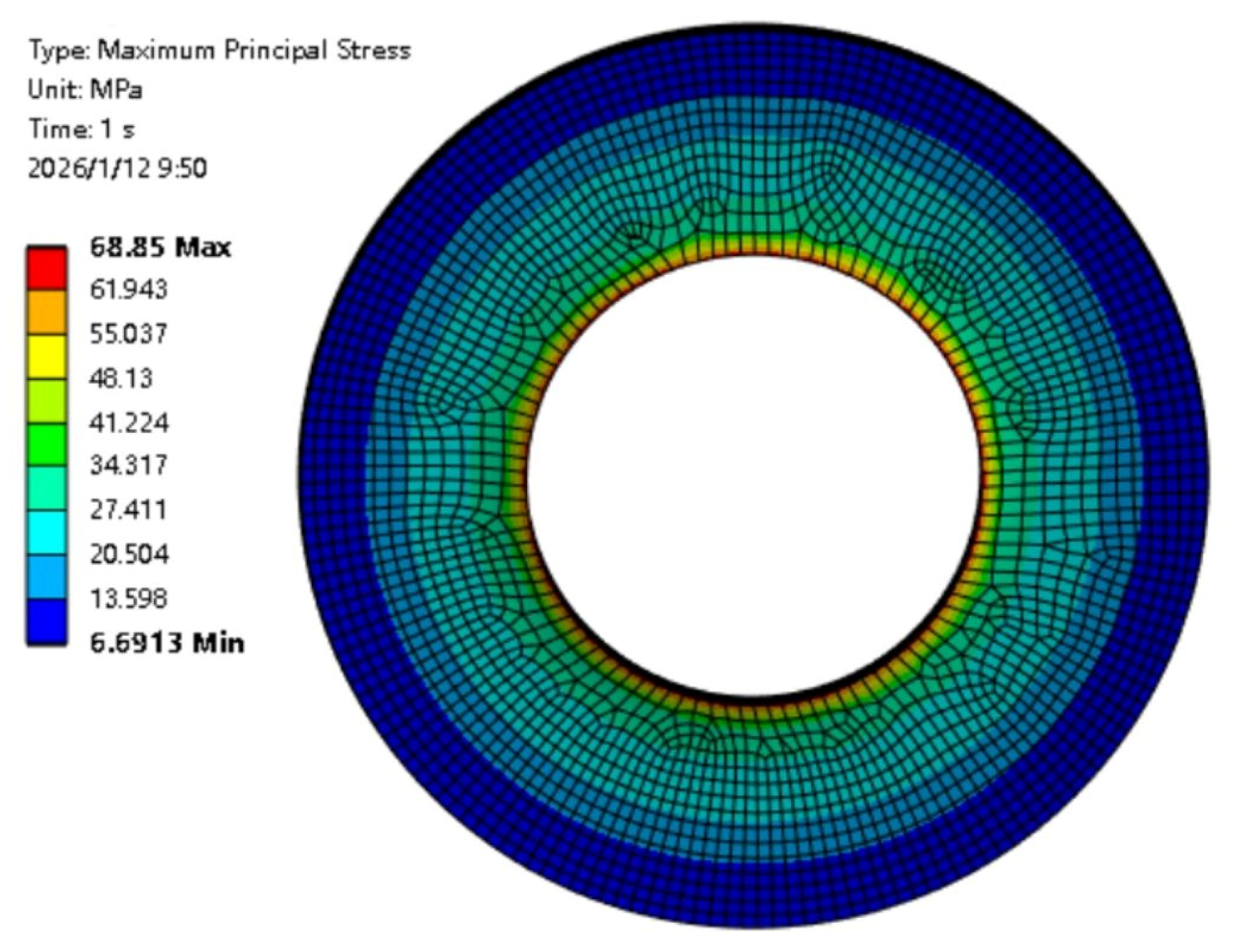 The structural strength of the permanent magnet under high-speed conditions was assessed based on the maximum principal stress. The finite element analysis results show that the peak maximum principal stress under rated working conditions is 68.85 MPa, which is lower than the tensile strength of the N42SH permanent magnet material. The stress distribution is uniform, indicating that the design meets the strength requirements with a sufficient safety margin. To further investigate the magnetic field distribution characteristics and the enhancement effect of the Halbach array, a magnetic field simulation was performed on the stacked structure of the inner and outer magnetic ring groups. The results are presented in