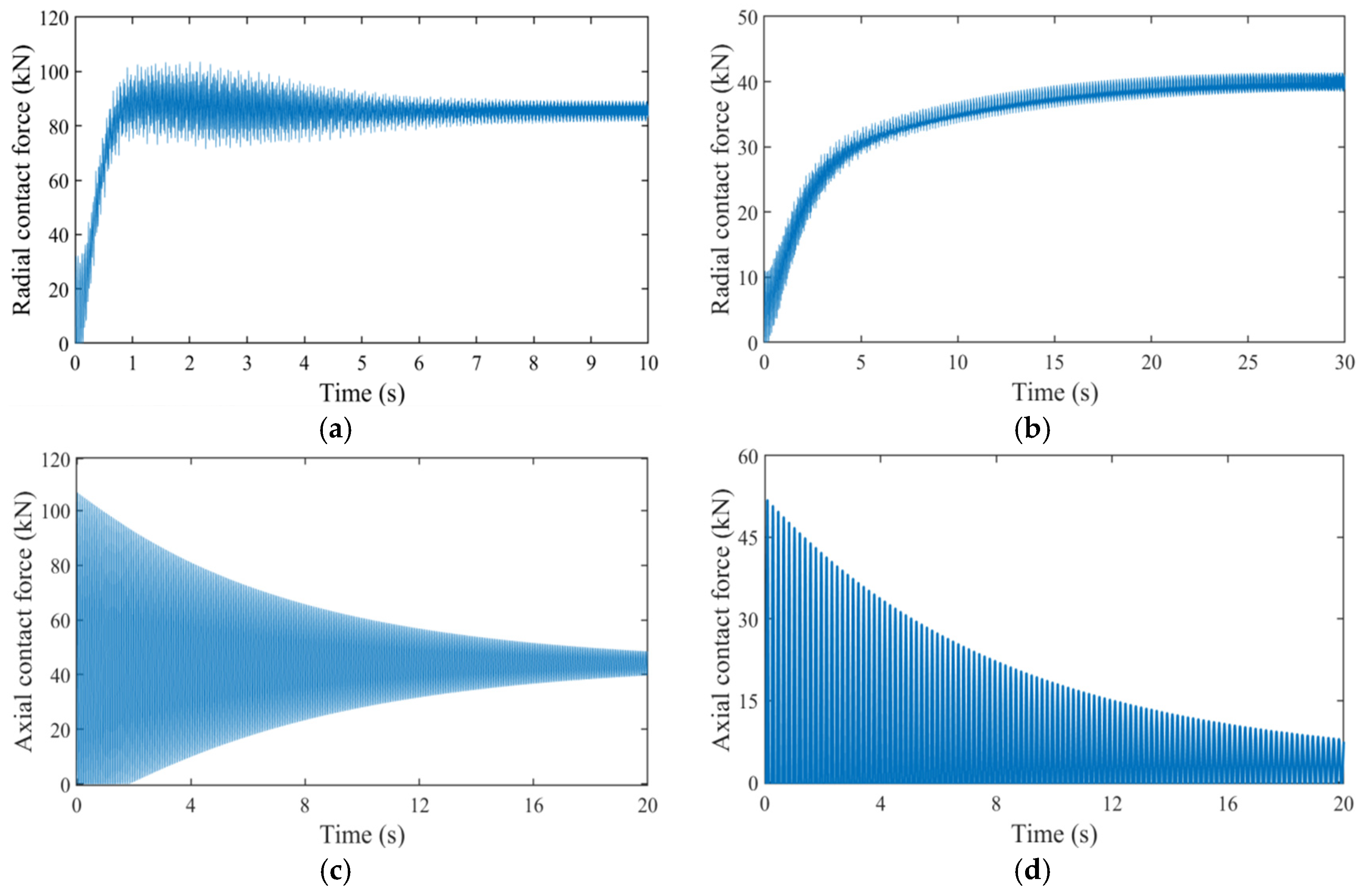 Figure 11a,b show that at 8000 rpm, the peak radial contact force dropped from 10 KN to 4 KN (a 60% reduction) after installing the permanent magnet bearing. Similarly,