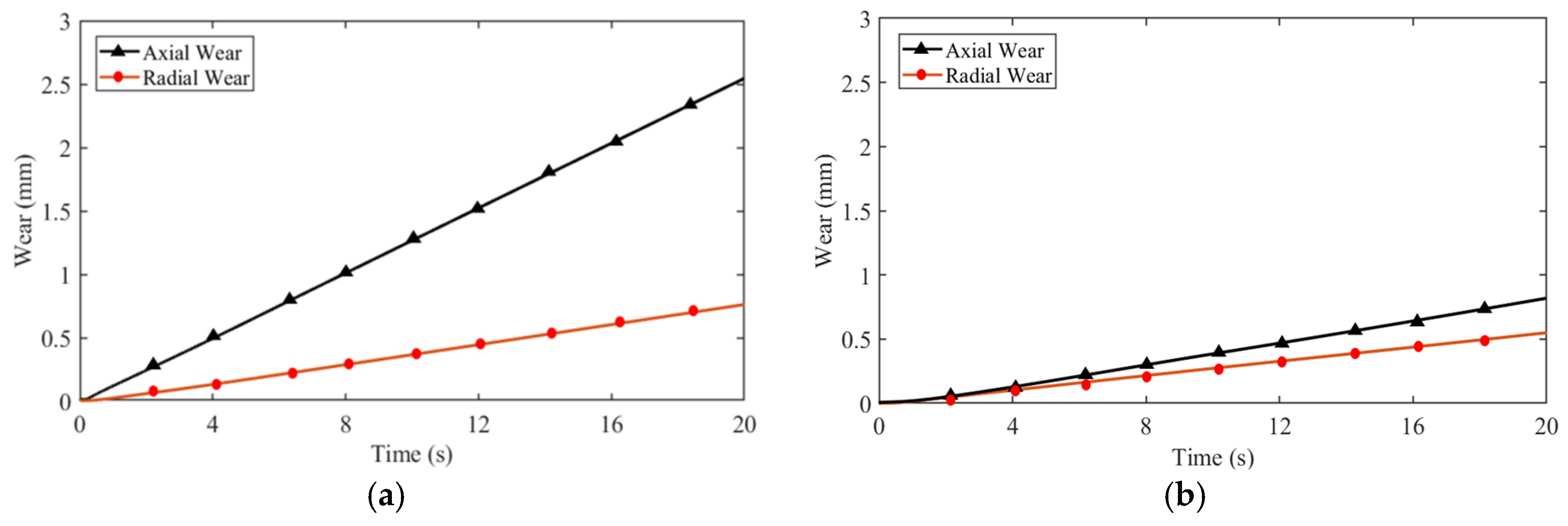 Figure 11c,d indicate that the axial contact force decreased from 10.8 KN to 4.9 KN (≈54% reduction). These results demonstrate the bearing’s effectiveness in sharing the impact load and alleviating stress on the mechanical bearing during rotor drop. Based on the Archard wear model, the suppression of system wear was also analyzed.