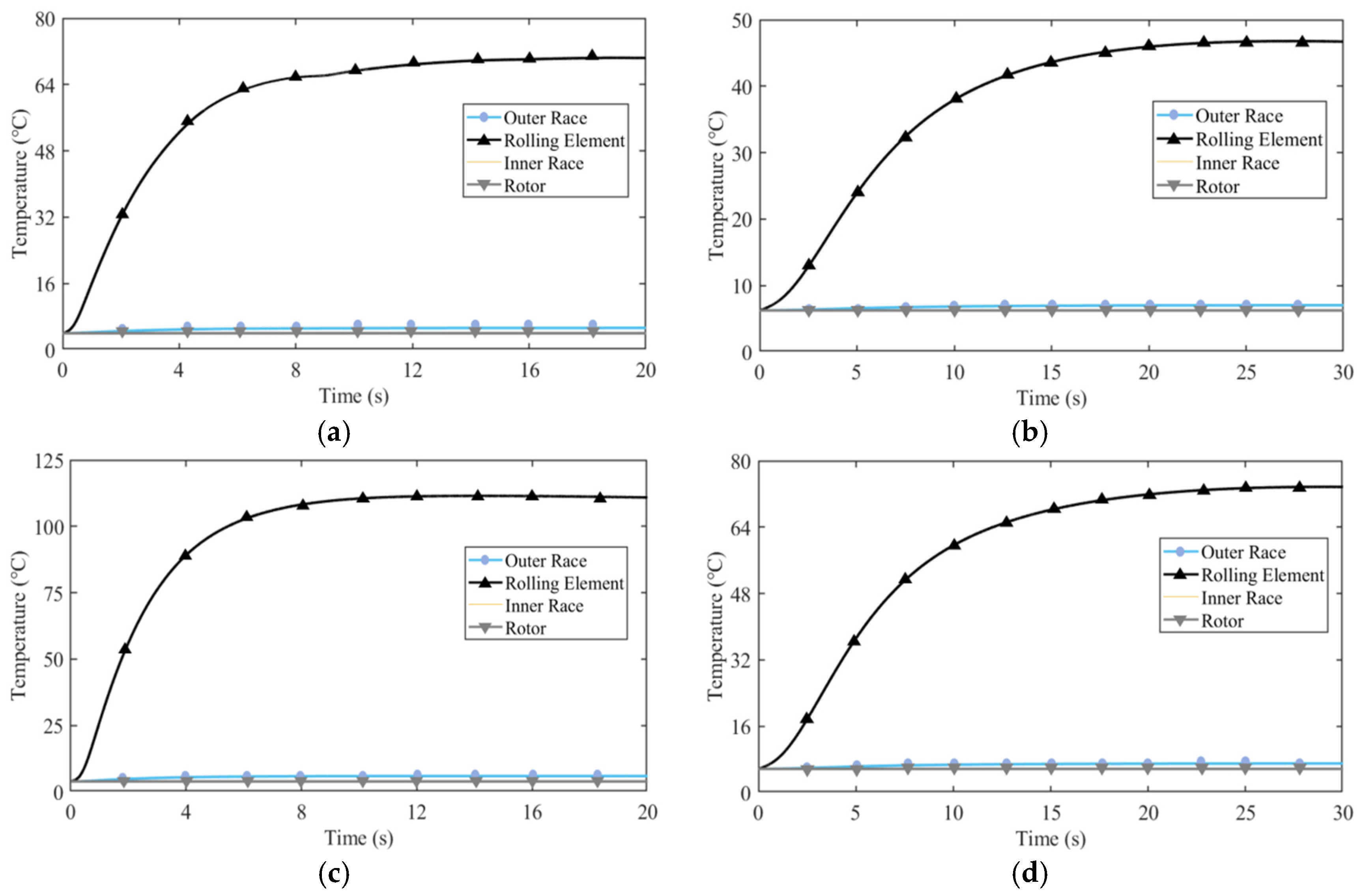The following describe Equation (6): Ha, Hr, and Hc, respectively, represent the heat generated by axial friction between the rotor and the inner ring of the protection bearing, the heat generated by radial friction, and the heat generated inside the protection bearing; νr represents the relative velocity between the rotor and the inner ring at the radial contact point; Ma represents the end face friction torque; θr and θb represent the angle changes in the rotor and the angle changes in the inner ring of the protective bearing; ωb represents the angular velocity of the rolling elements; ωn and ωw represent the spin angular velocity of the rolling elements in contact with the inner and outer rings; Mi,j and Mo,j represent the the viscous friction torque between the rolling elements and the inner and outer rings; Mn and Mw represent the spin torque of the inner and outer rings.
