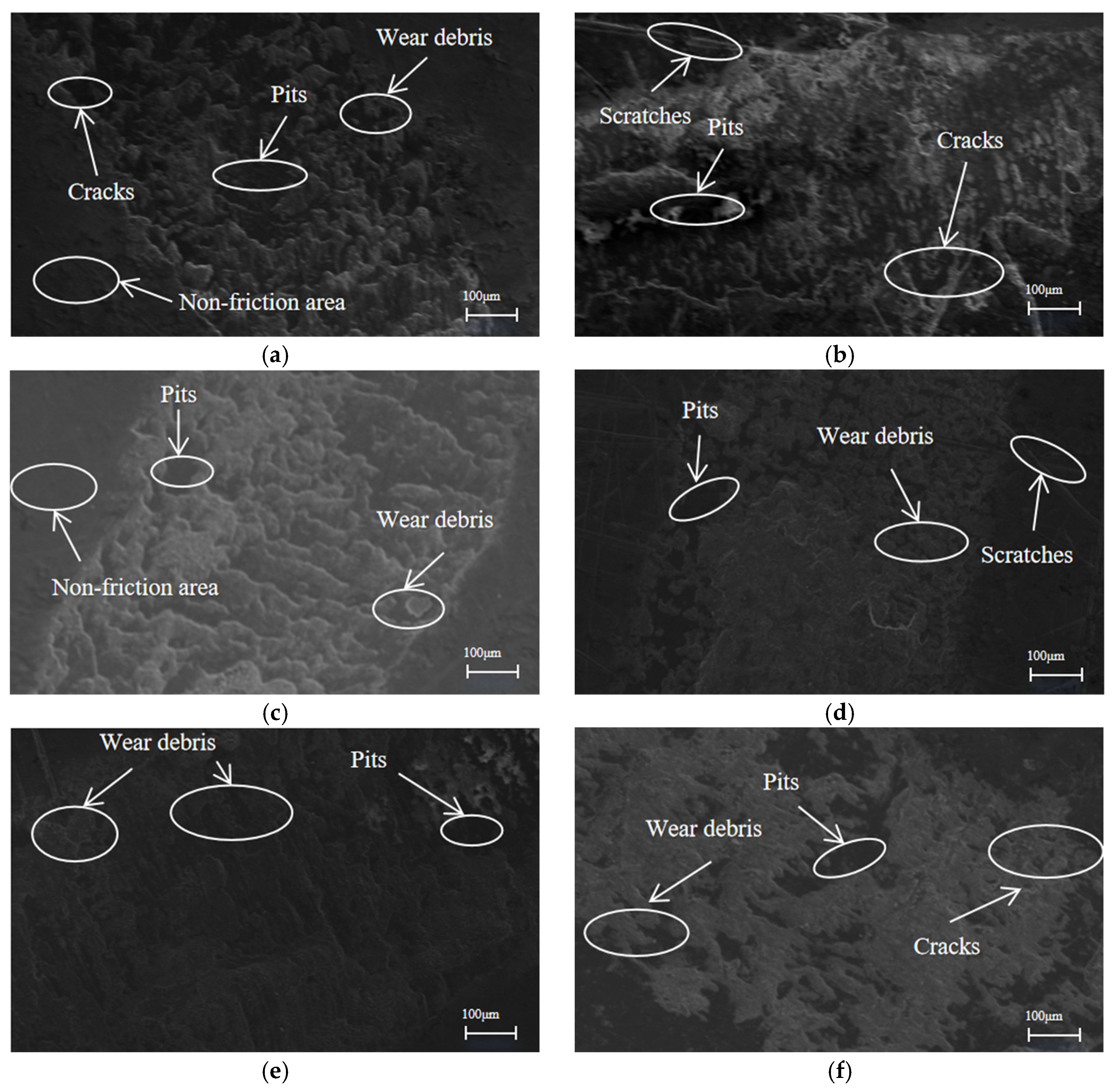 Figure 16e, large cracks and local spalling can be seen, with deep wear marks and surface granulation, which may have been related to larger friction force. This morphology was common in high-load or long-term friction conditions, and high stress led to plastic flow and surface failure of materials. In