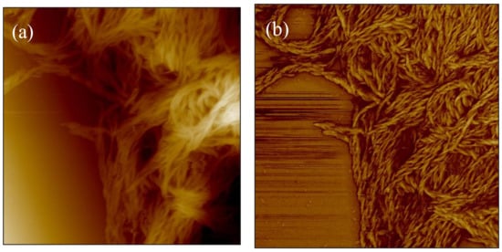 AFM images of the microstructure of a lithium grease thickener over a 10 × 10 μm2 area. AFM operating modes: (a) topographic, (b) phase (from the author’s own collection, M. Paszkowski).