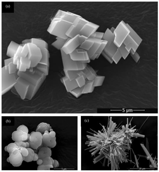 SEM images of the structures of (a) calcite, (b) aragonite, and (c) vaterite [36].