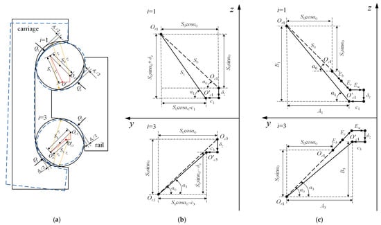 . According to Figure 3c, the raceway curvature center distance for a guide under both comprehensive errors and an external load is given by the following geometric relationship: