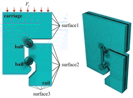 In practical operation, the rail is secured to the machine bed by bolts; therefore, as shown in Figure 6, a fixed boundary condition was assigned to the bottom surface of the rail (Surface 3). Symmetry constraints were applied to the symmetry planes of the carriage and rail (Surface 1 and Surface 2), and the vertical load was equivalent to a uniform pressure applied to the top surface of the carriage. The contact between the balls and raceways was defined using the “surface-to-surface contact” property. Tangential behavior was governed by the penalty method with a friction coefficient of 0.002, while normal behavior was modeled using “hard contact.” Preload was simulated via an interference fit between the balls and raceways. Within the “contact interference” option in ABAQUS, the initial interference was gradually removed during the first analysis step to establish a stable preloaded state. In this section, a medium preload level (12 μm) was adopted for both the analytical and FEA calculations. To balance computational accuracy and efficiency, the model primarily employed eight-node linear hexahedral reduced-integration elements (C3D8R), which exhibit superior performance in resisting shear locking when calculating contact pressure distributions. A small number of wedge elements (C3D6) were utilized in irregular transition regions. To verify mesh convergence, contact region mesh sizes of 0.1 mm, 0.05 mm, and 0.025 mm were tested. The results indicated that the fluctuation in maximum contact stress was less than 1.8% when the mesh was refined from 0.05 mm to 0.025 mm; thus, 0.05 mm was determined as the optimal mesh size.