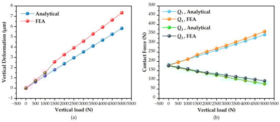 Comparison of Analytical and FEA Results: (a) Vertical Deformation; (b) Contact Load.