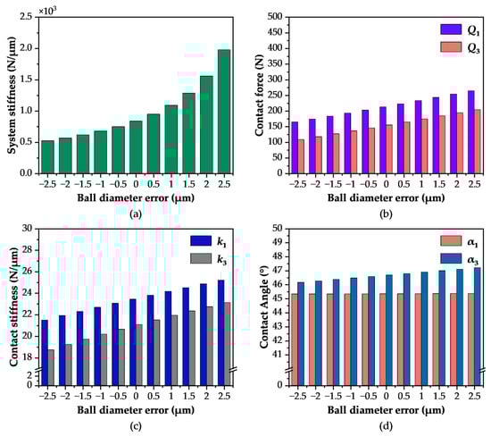Influence of Ball Diameter Error on Contact Characteristics: (a) Vertical Stiffness; (b) Contact Load; (c) Contact Stiffness; (d) Contact Angle.