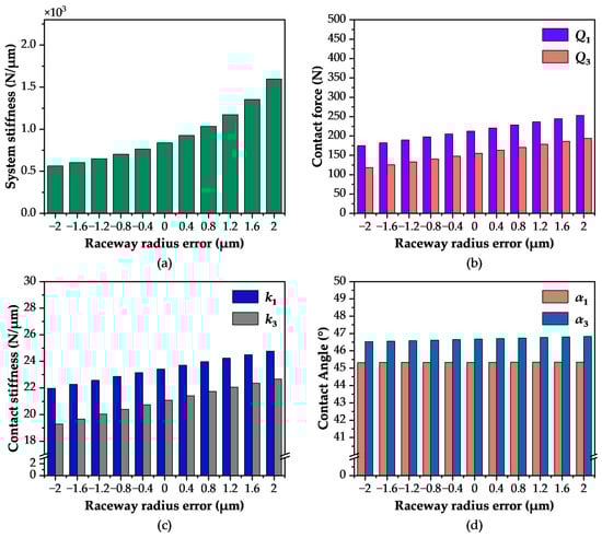 Influence of Raceway Radius Error on Contact Characteristics: (a) Vertical Stiffness; (b) Contact Load; (c) Contact Stiffness; (d) Contact Angle.