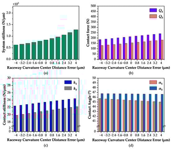 Influence of Raceway Curvature and Center Distance Error on Contact Characteristics: (a) Vertical Stiffness; (b) Contact Load; (c) Contact Stiffness; (d) Contact Angle.